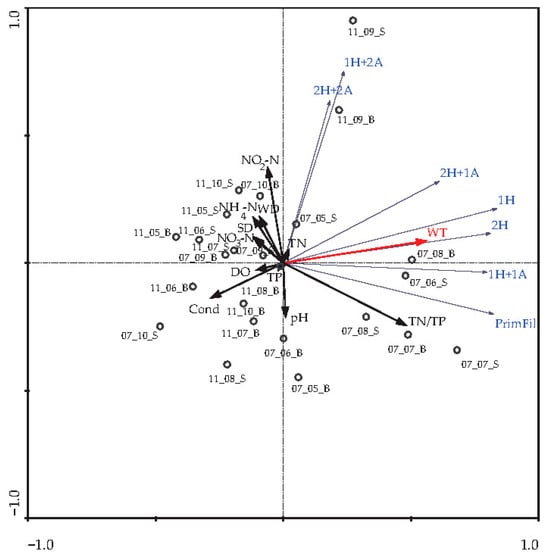 Triplot of environmental parameters and morphological forms of R. raciborskii from May to October of 2007 and 2011. Statistically significant environmental variable (WT) is marked in a red color. Legend: 11_08_4m (year_month_depth); for the morphological forms of R. raciborskii, see legend in Figure 2.