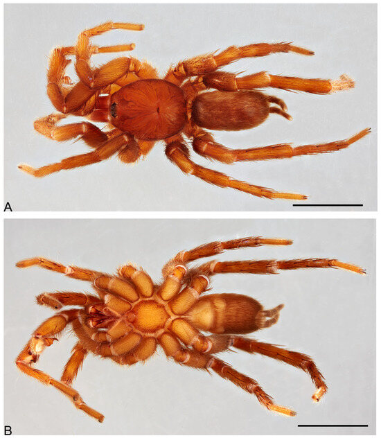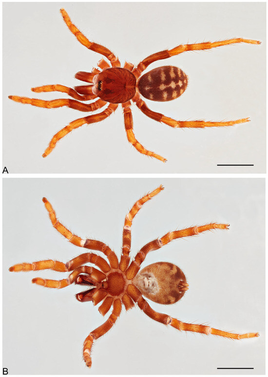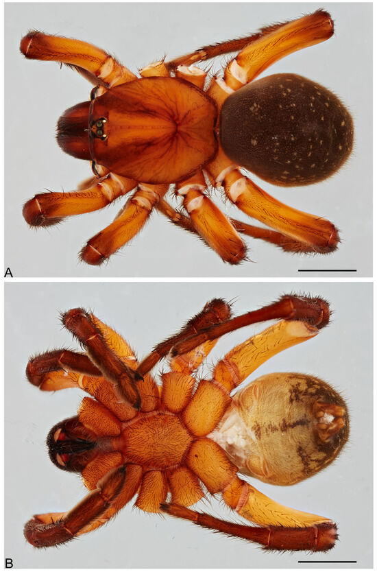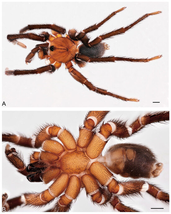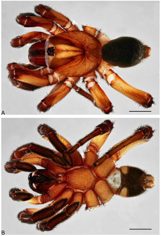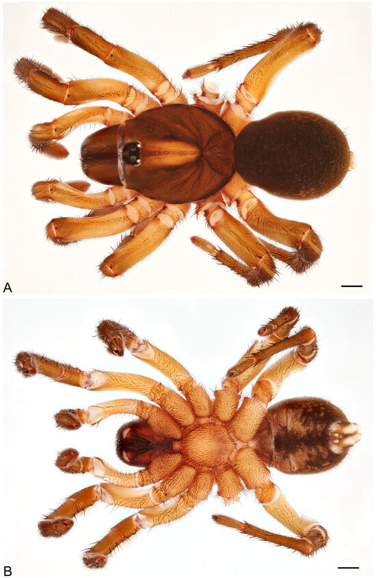 Actinopus nattereri (Doleschall, 1871) female holotype. (A) Habitus, dorsal view. (B) Habitus, ventral view. Scale bars: 5.0 mm.
