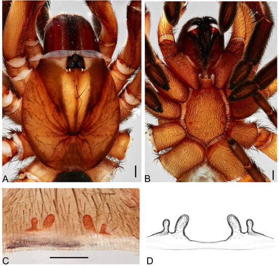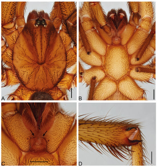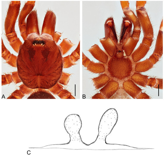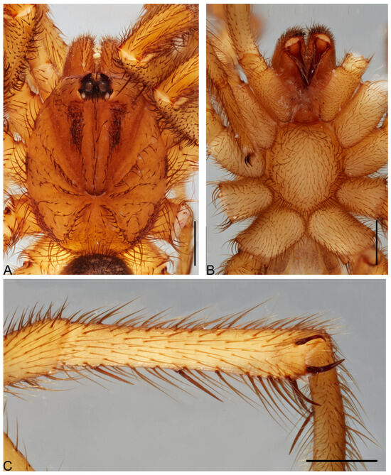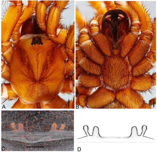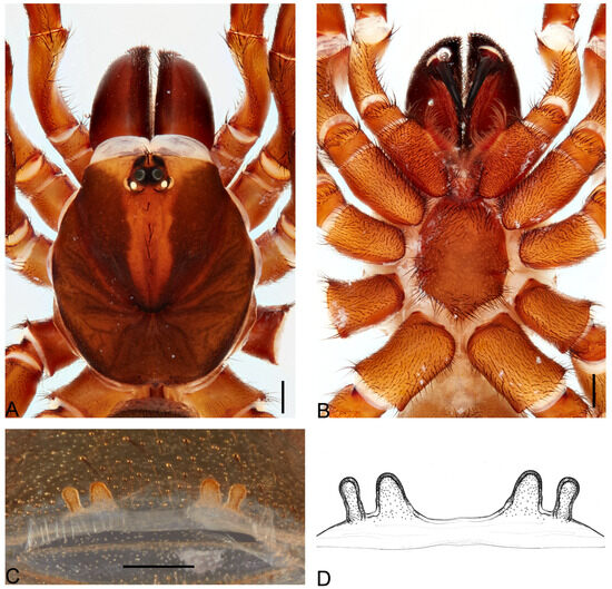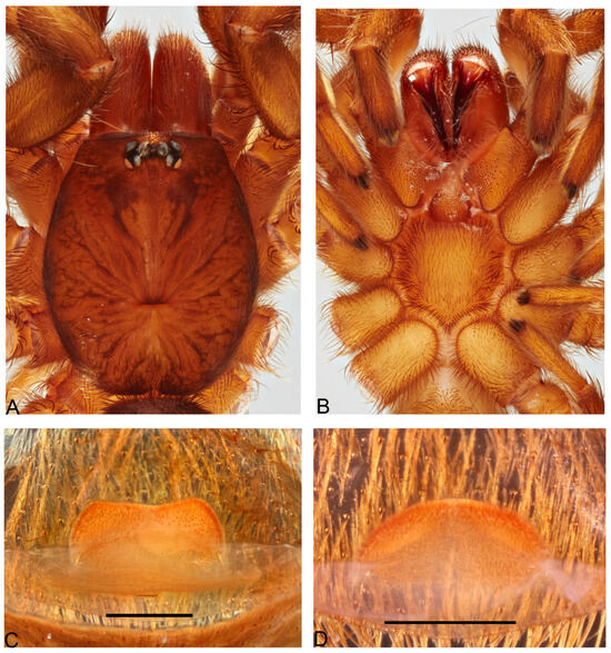 Cephalothorax. Carapace dark red-brown; pars cephalica highly elevated; pars thoracica flat; fovea wide, procurved (Figure 3A). Labium and endites cuspules unobservable (Figure 3B). Eyes, eight in two rows; AME 0.38; ALE 0.52; PME 0.30; PLE 0.29; PME-PME 1.98; ocular quadrangle, anterior 3.24; posterior 3.03, height 1.23. Chelicerae dark red-brown; teeth unobservable; rastellum damaged (Figure 3B). Sternum longer than wide (4.25 length; 3.59 width); postlabial sigillum deep, posterior sigilla shallow and not visible (Figure 3B).