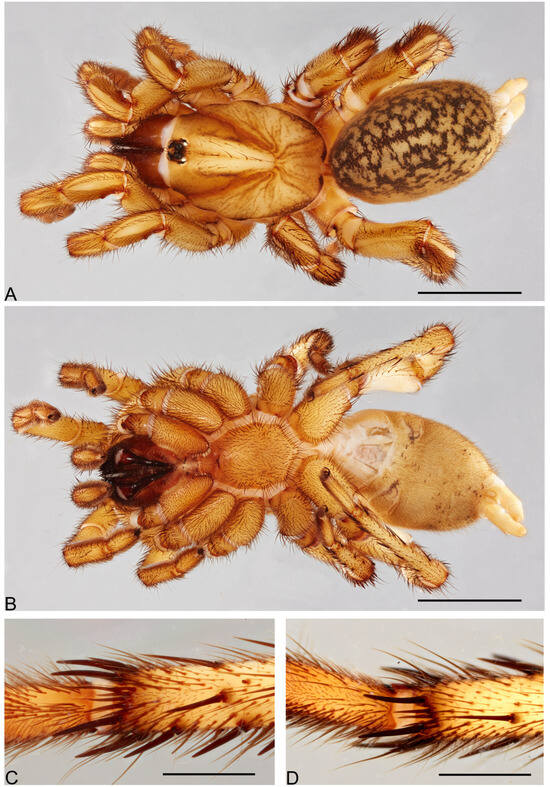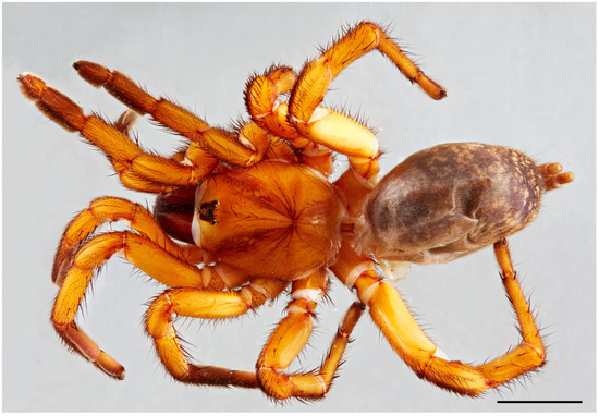 Mygalomorphs are a primitive group of spiders that represent an ancient lineage, with a fossil record dating back to the Middle Triassic period [50]. Identifying this group is often perceived as challenging due to their homogeneous morphology [1,51,52].