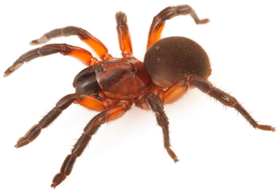 - Hedin, M.; Bond, J.E. Molecular phylogenetics of the spider infraorder Mygalomorphae using nuclear rRNA genes (18S and 28S): Conflict and agreement with the current system of classification. Mol. Phylo. Evol. 2006, 41, 454–471. [Google Scholar] [CrossRef]
