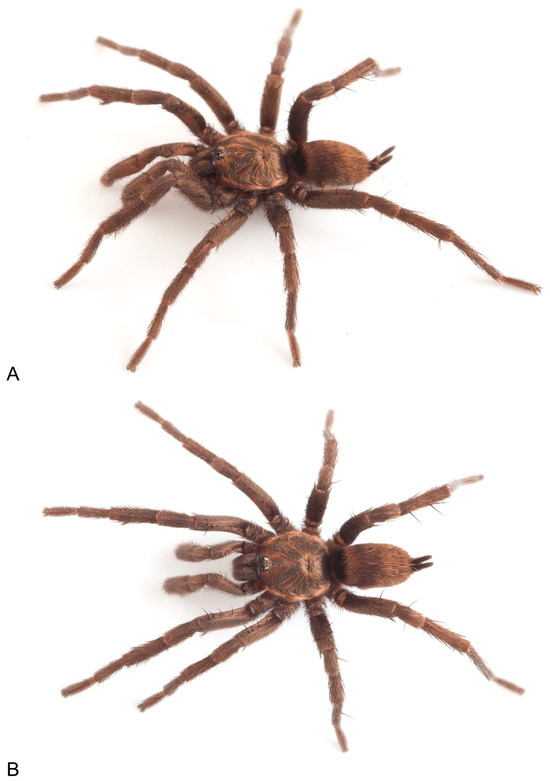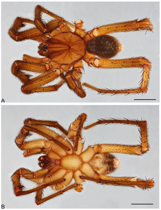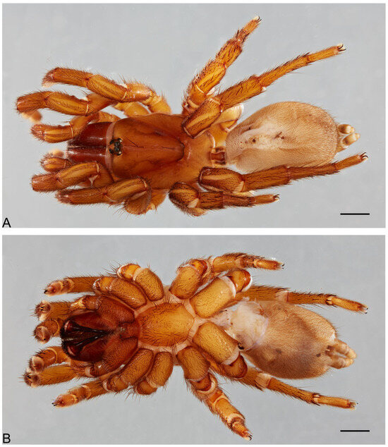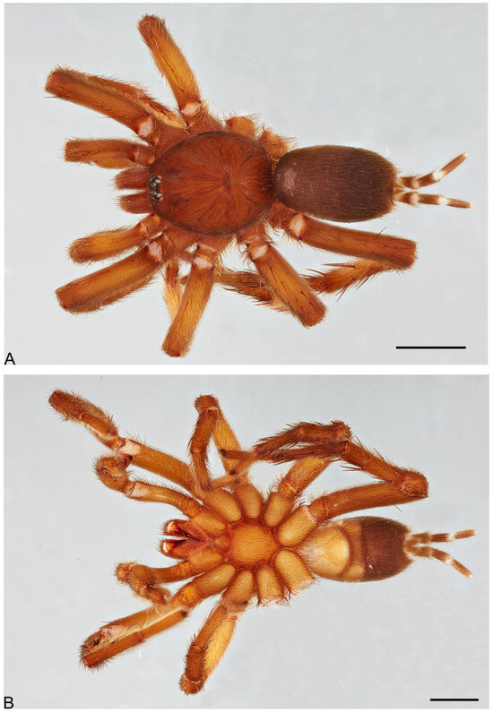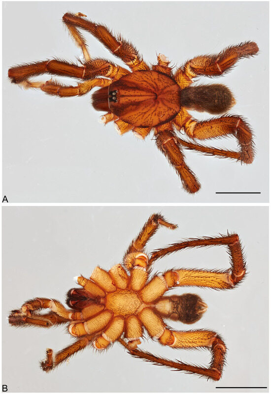 Actinopus saraguro n. sp., female holotype. (A) Habitus, dorsal view. (B) Habitus, ventral view. Scale bars: 5.0 mm.