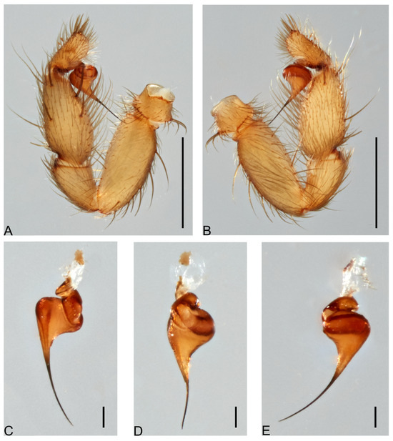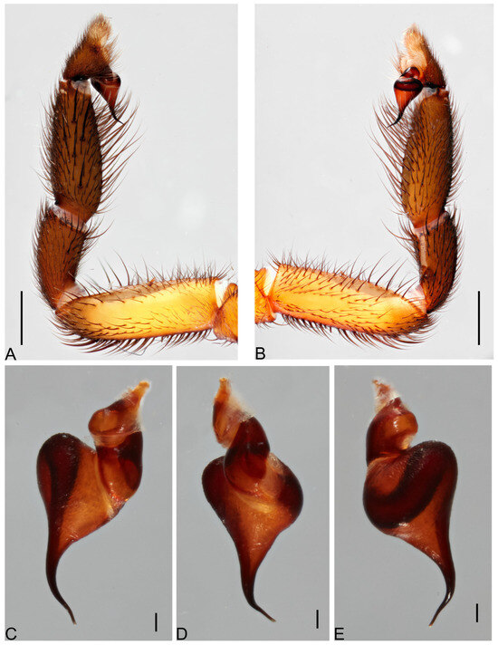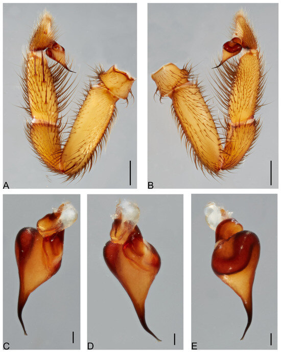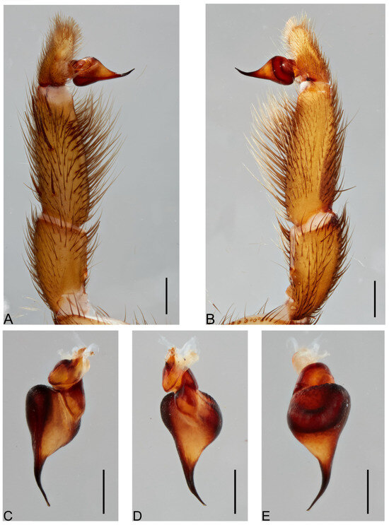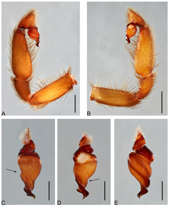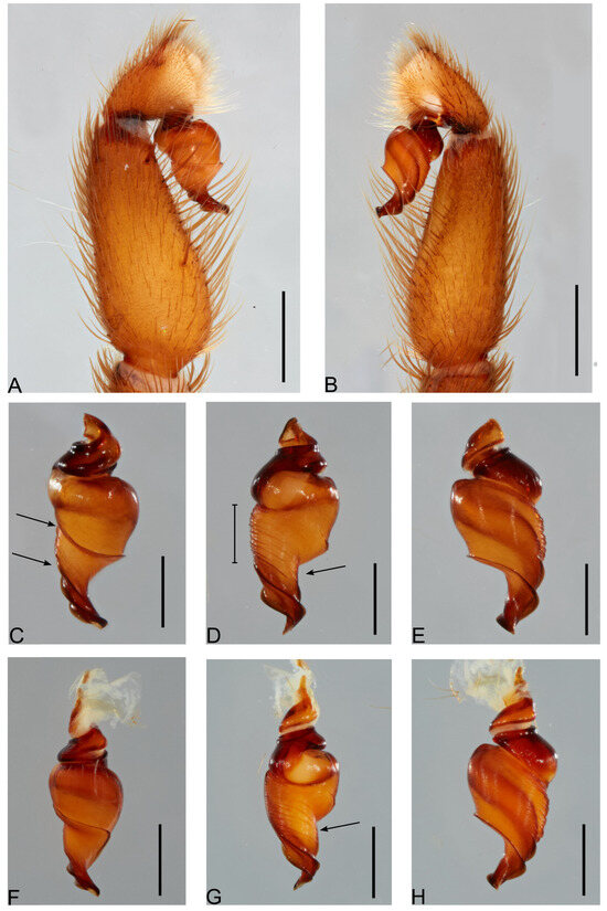 Diagnosis. Males most resemble A. confusus Miglio et al., 2020, and A. osbournei Miglio et al., 2020, based on their pointed paraembolic apophysis and the presence of prolateral superior keel, prolateral inferior keel, and prolateral accessory keel (Figure 4C,D), but are distinguished by their triangular paraembolic apophysis and excavated base of embolus without serration (Figure 4D, arrow), while paraembolic apophysis oval or rounded and base of embolus not excavated and with serrated area in the two latter species [8] (see Miglio et al., 2020: figs 44, 135).