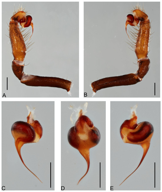 Genitalia. Palpal tibia (0.82 length, 0.42 width) with 5 prolateral spines and 1 retrolateral spine (Figure 58A,B); cymbium with 4–5 spines apically (Figure 58A,B); bulb pyriform with embolus tapered in middle portion, gradually curving (Figure 58C–E).
