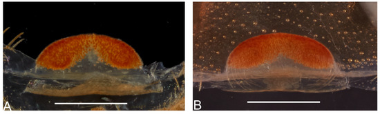 Note. The female specimen was redescribed by Doleschall in 1871 [25], based on a specimen from the Rio Negro in Brazil. The Rio Negro flows for approximately 2250 km through the Amazon region, making it difficult to identify a specific locality for the type specimen. Miglio et al. [8] (2020) conducted a further redescription of the species, examining both males and females from the same region. However, their observations of the female genitalia [8] (see Miglio et al., 2020: fig. 67D) revealed differences: they described the spermathecae as unilobed and uniformly triangular, while the type specimen’s spermathecae is considered bilobed, with a larger external lobe (Figure 2C). As a result, the specimen described by Miglio et al. [8] (2020) is regarded as a possible misidentification.