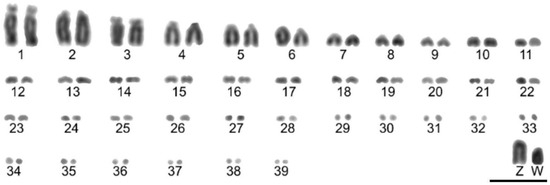 Karyotype of a female Lepidocolaptes falcinellus (2n = 80). Pairs 1 and 2 are acrocentric, pair 3 is submetacentric, and all remaining chromosomes, including both macrochromosomes and microchromosomes, are telocentric. The sex chromosomes are acrocentric, with the Z chromosome similar in size to pair 4 and the W chromosome similar in size to pair 6. Scale bar = 10 μm.