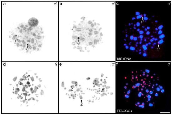 Chromosome banding patterns in Lepidocolaptes falcinellus: (a) NORs; (b) associated NORs; (c) 18S rDNA probe detected by FISH; (d,e) constitutive heterochromatin; (f) telomeric probes detected by FISH. Chromosomes bearing NORs/18S rDNA signals (a–c) and sex chromosomes (d,e) are indicated. Scale bar = 10 μm.