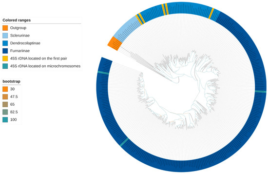 Phylogenetic reconstruction analysis of the Furnariidae corroborates the monophyly of three major clades, Sclerurinae, Dendrocolaptinae, and Furnariinae, with high nodal support, reinforcing taxonomic boundaries previously established by prior molecular and morphological analyses, confirming their evolutionary divergence and taxonomic distinctiveness. Among Dendrocolaptinae, the conserved localization of the 45S rDNA cluster on the first pair of macrochromosomes in G. spirurus, S. griseicapilus, L. angustirostris, L. falcinellus, and D. platyrostris [17,19,21] underscores a shared cytogenetic signature within this clade. In contrast, the microchromosal placement of this cluster in the Furnariinae species S. rufosuperciliata, C. obsoleta, and S. frontalis [18,20] aligns with their phylogenetic divergence from Dendrocolaptinae, suggesting subfamily-specific evolutionary trajectories in genome organization. These differential rDNA patterns reinforce the deep evolutionary split between Dendrocolaptinae and Furnariinae inferred from molecular phylogenies, with karyotypic conservation likely reflecting ancestral states or stabilizing selection in Dendrocolaptinae, while microchromosomal positioning in Furnariinae may signal lineage-specific genomic reorganization. Lack of 45S rDNA data for Sclerurinae provides a framework to investigate potential correlations between their phylogenetic distinctiveness and unique cytogenetic features.