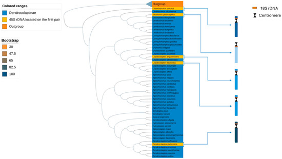 - Degrandi, T.M.; Gunski, R.J.; Garnero, A.d.V.; de Oliveira, E.H.C.; Kretschmer, R.; de Souza, M.S.; Barcellos, S.A.; Hass, I. The distribution of 45S rDNA sites in bird chromosomes suggests multiple evolutionary histories. Genet. Mol. Biol. 2020, 43, e0331. [Google Scholar] [CrossRef]