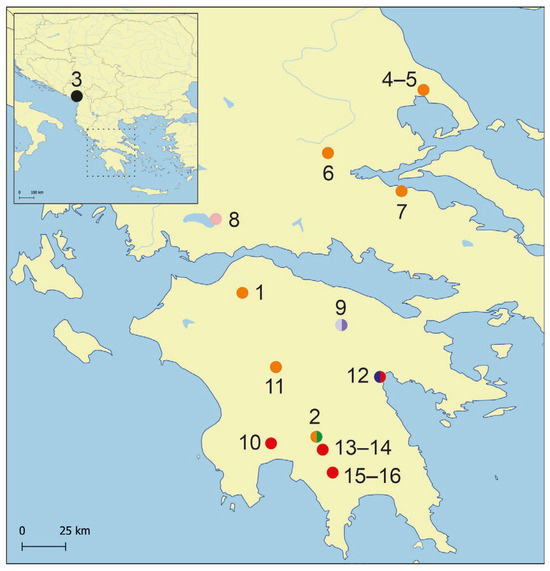 The snails were collected at 16 localities (Figure 1, Figure 2 and Figure 3, Table 1), 15 of them in Greece, one in Montenegro, in the period 2001–2008, and 2012–2022. Fourteen of them were the same as in the study of Falniowski et al. [1]. For the molecular study snails were washed twice in 80% analytically pure ethanol and left to stand in this solution for ca. 12 h, after which the solution was changed twice in 24 h. Finally, after a few days, the 80% solution was exchanged for a 96% solution of ethanol and the material was stored at –20 °C. Snails for the morphological study were fixed in 10% buffered formalin.