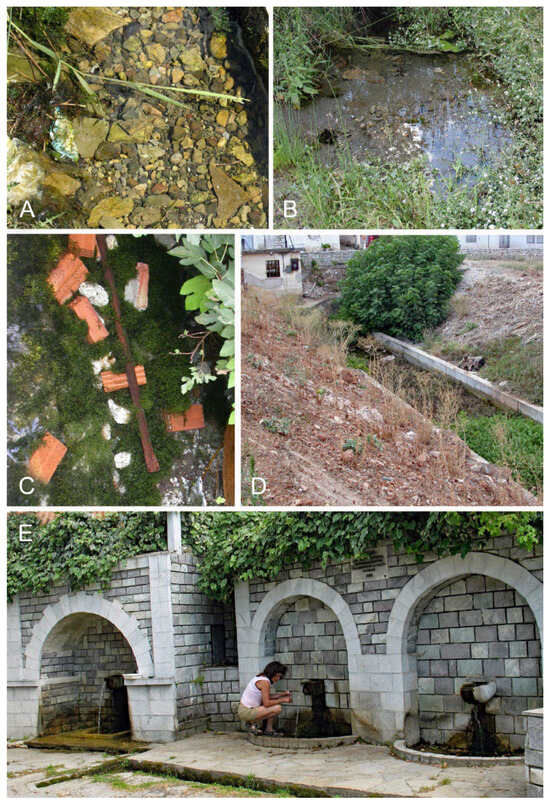 Studied localities: (A). spring between Palaiochori and Karkalou, WNW of Tripolis, Peloponnese (11). (B). spring S of Koumousta, Taigetos Mts., Peloponnese (15). (C,D). spring at Mili (Lérni), Peloponnese (12). (E). spring S of Koumousta, Taigetos Mts., Peloponnese (16). Photographs Andrzej Falniowski.