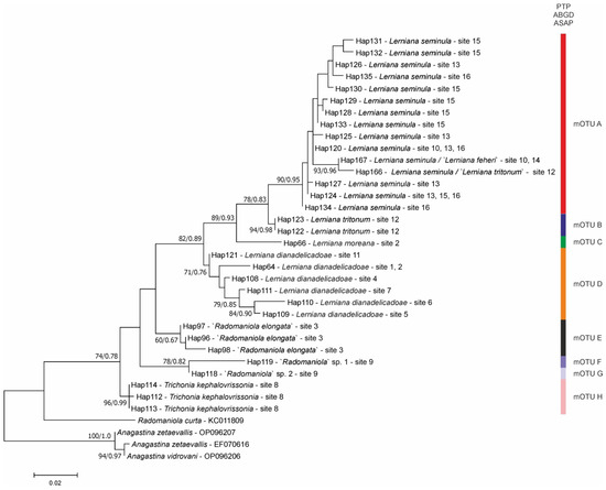 We obtained five new COI sequences of Lerniana (457 bp, GenBank accession numbers PX096765-PX096769). The test for the substitution saturation analysis showed an ISS (0.73) significantly smaller than the critical ISS value (0.93), indicating that sequences were not saturated and thus useful in phylogenetic reconstruction. The topologies of the resulting phylograms were identical in both the ML and BI phylogram analyses, thus we present the phylogram computed with RAxML. In our tree (Figure 4) a well-supported (bootstrap 74%) clade, distinct from the one grouping Radomaniola, consisted of Lerniana (bootstrap support 82%, “Radomaniola” elongata (Radoman, 1973) (bootstrap support only 60%), unclassified clade consisted of probably two undescribed species (bootstrap support 78%), and Trichonia (bootstrap support 96%). The p-distances between these four clades varied from 0.037 to 0.089. The species delimitation indicated eight distinct mOTUs (A–H), probably at the species level, with p-distances between 0.026–0.106 (Table 2). These mOTUs differed from the representatives of the genera Radomaniola and Anagastina by 6.4 to 13.9%, always over 10% for Anagastina.