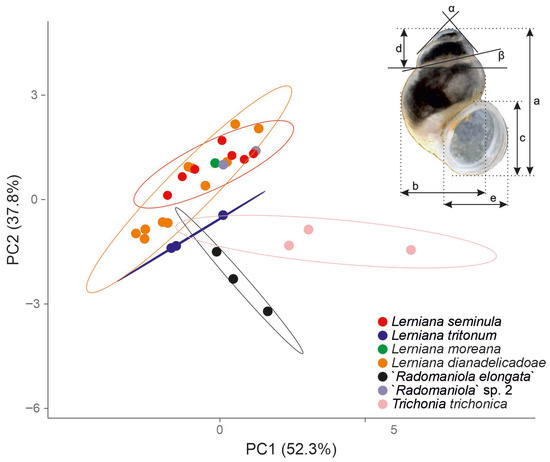 Principal component analysis (PCA). Projection into PC1 (52.3% of the total variation) and PC2 (37.8%); cumulatively they explain 90.2% of the total variation. The shell measurements are also shown. Abbreviations: a—shell height; b—body whorl breadth; c—aperture height; d—spire height; e—aperture breadth; α—apex angle measured between the lines tangential to the spire; β—angle between the body whorl suture and the line perpendicular to the columella. Measurements’ values given in Table 3.