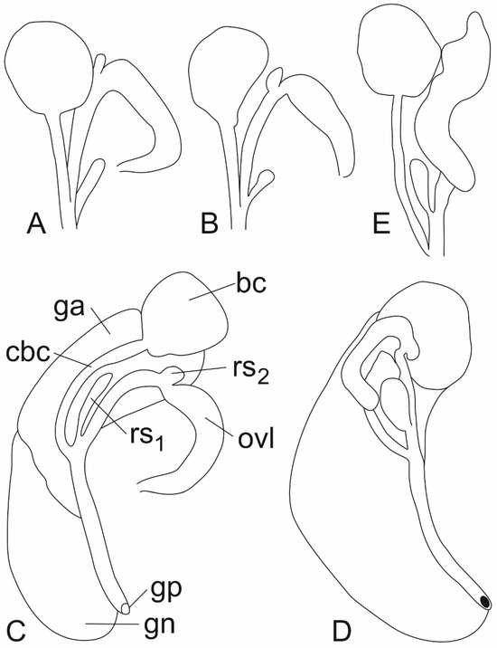 Female reproductive organs: (A). Lerniana seminula, (bursa copulatrix, receptaculum seminis and loop of oviduct), locality 16. (B). Lerniana tritonum, female reproductive organs (bursa copulatrix, receptaculum seminis and loop of oviduct), locality 12. (C). “Radomaniola” elongata. (D). “Radomaniola” sp., locality 9. (E). Trichonia trichonica (bc—bursa copulatrix, cbc—duct of bursa copulatrix, ga—albuminoid gland, gn—nidamental gland, gp—gonoporus, ovl—loop of (renal) oviduct, rs1—distal receptaculum seminis, rs2—proximal receptaculum seminis).