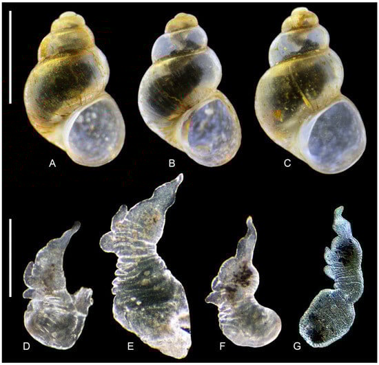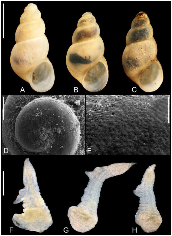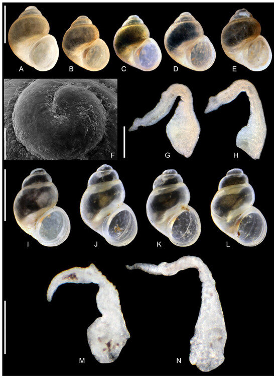 - Falniowski, A.; Jaszczyńska, A.; Osikowski, A.; Hofman, S. Litthabitellidae: A new family of the Truncatelloidea (Caenogastropoda). J. Nat. Hist. 2023, 57, 299–329. [Google Scholar] [CrossRef]