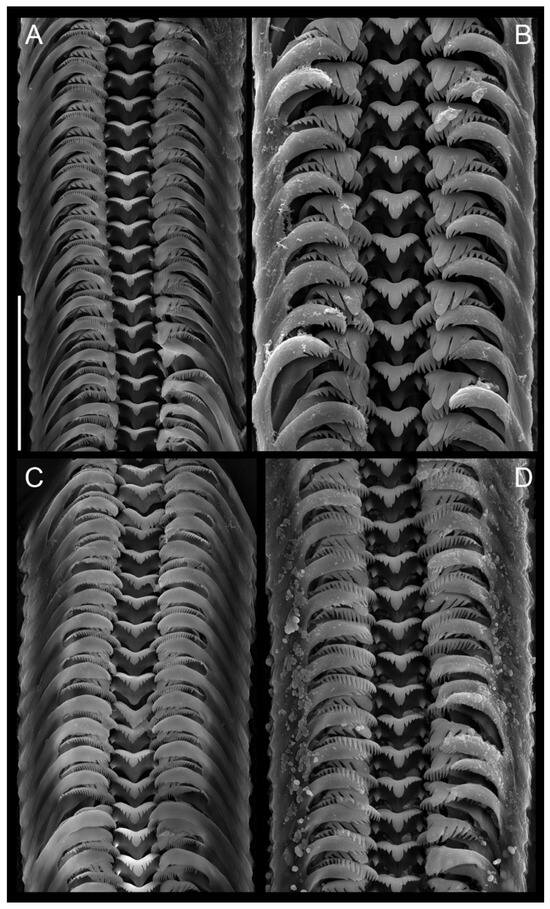 Radulae. (A). Lerniana dianadelicadoae sp. nov. (B). “Radomaniola” elongata. (C). “Radomaniola” sp., locality 9. (D). Trichonia trichonica. Bar equals 50 µm.