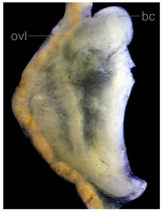 Soft parts morphology and anatomy: Head and mantle pigmented intensely black. Female reproductive organs (Figure 11) with moderately big spherical bursa copulatrix, broad and prominent loop of oviduct, proximal receptaculum seminis (rs2) [42] relatively broad, distal one (rs1) [42] small and spherical. Penis (Figure 9G,H,M,N) long and narrow, with no outgrowth on its left side, vas deferens visible inside.