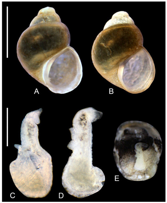 Lerniana, locality 2: (A,B). shell. (A). L. dianadelicadoae sp. nov. (B). L. moreana sp. nov. (C–E). penis, L. moreana sp. nov. Bar equals 1 mm; for shells and 200 µm for penes.