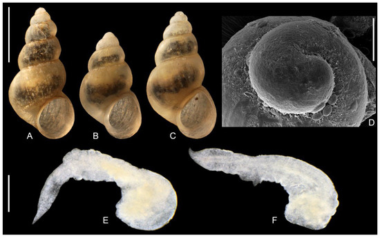 Shell: (Figure 5A–F) up to 1.86 mm high, ovate-conical, broad, with relatively low spire, with about 4.5 whorls, spire low, its height 14–21% of the shell height, body whorl broad. Teleoconch whorls moderately convex, evenly rounded, growing regularly in diameter. Aperture narrow ovoid, outer lip simple, parietal lip broad and complete, umbilicus absent or slit-like. Teleoconch moderately thick-walled, its wall translucent, with delicate growth lines, periostracum whitish or yellowish. Shell measurements: Table 3, Figure 6. Operculum paucispiral, smooth on its both surfaces.