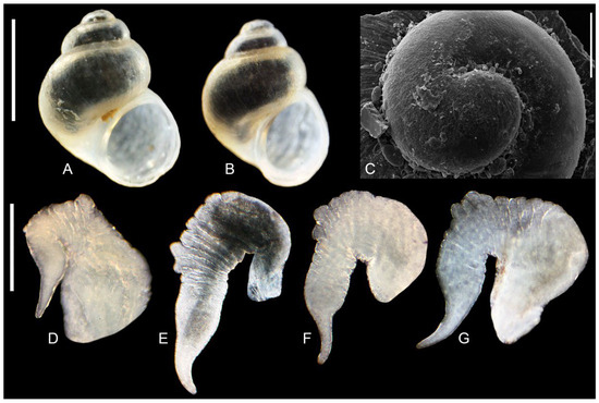 Lerniana tritonum, locality 12. (A–C). shell. (D–G). penis. Bar equals 1 mm for shells and 200 µm for penes.