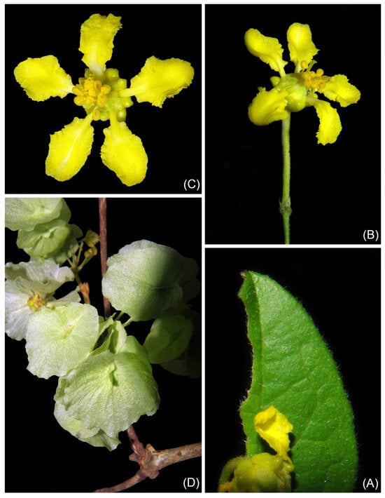 Figure 4. Field photographs of Mascagnia conformis: (A) details of the stipules, petioles and leaf base, (B) flowering branch, (C) detail of a thyrse, (D) detail of a flower in frontal view (photographs by Luiz Otavio Adao Teixeira).