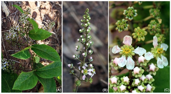 Figure 13. Field photographs of Mascagnia tucuruensis: (A) vegetative branches and leaves, (B) detail of the inflorescence showing floral buds and flowers in anthesis, (C) detail of the winged mericarps (photographs by Ricardo Ribeiro).