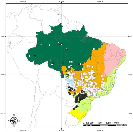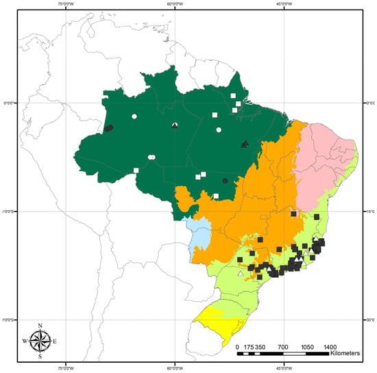 Distribution of species of Mascagnia in Brazil: M. affinis—dark square, M. aptera—white circle, M. arenicola—white triangle, M. australis—dark triangle, M. bierosa—dark circle, M. conformis—white square. Amazon rainforest—dark green, Atlantic rainforest—light green, Caatinga dry forests—light red, Cerrado savannas—orange, Pampa grasslands—yellow, and Pantanal wetlands—light blue.