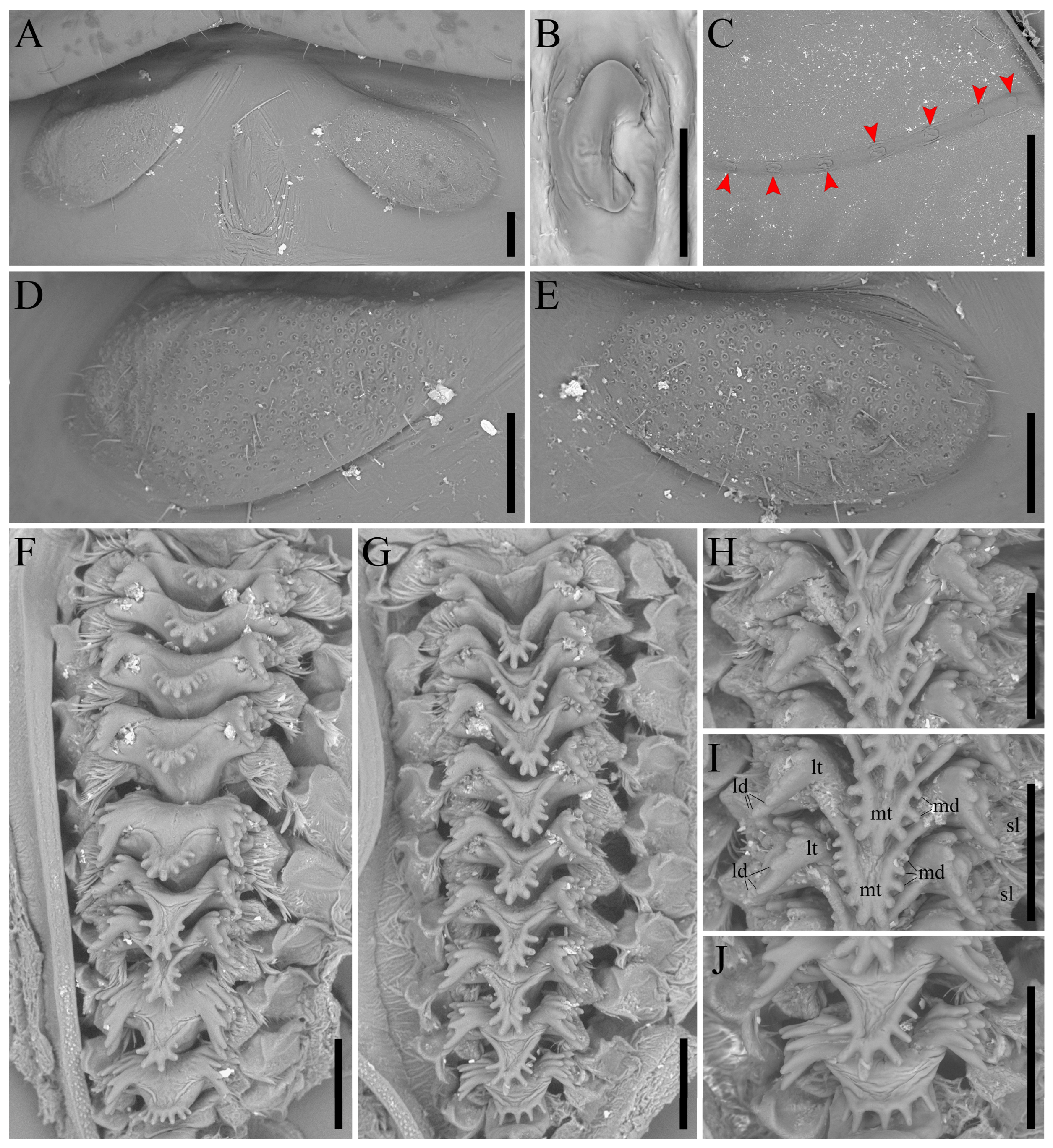 Proventriculus (paratype ISLA144205, Figure 3F–J)–consisting of six rows of nine or ten overlapping sclerotized appendices, divided into a pair of sclerotized lobes (sl) bearing a cluster of setae, a pair of lateral teeth (lt), and a median tooth (mt); lateral teeth with up to 12 lateral denticles (ld); median tooth with at least five and up to 11 median denticles (md); denticles short or elongated but always rounded at the apex; the most anterior and posterior sclerotized appendices may be regular or differentiated; the anterior sclerotized appendix either lacking a median tooth or bearing one with fewer median denticles; the posterior sclerotized appendix bearing a broadened median tooth with almost parallel median denticles.