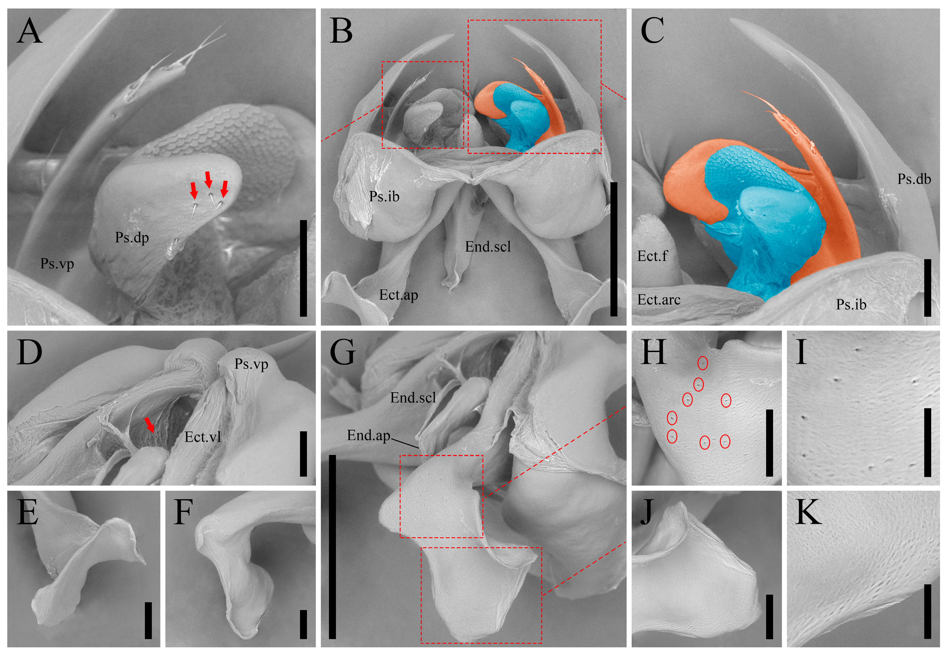 Figure 6. Igatuia cavernicola gen. et sp. nov. scanning electron micrographs of male genitalia (paratypes, ISLA144202, ISLA144205): (A) dorsal and ventral pseudepiphallic parameres, dorsal view, red arrows indicate setae at the posterodorsal cusp, scale bar–0.1 mm; (B) phallic complex, dorsal view, with Ps.dp and Ps.vp highlighted in blue and orange, respectively, scale bar–0.5 mm; (C) Ps.dp (blue) and Ps.vp (orange), dorsal view, scale bar–0.1 mm; (D) median portion of the phallic complex, lateroventral view, red arrow indicates the Ps.dp inner surface bearing setae or their insertion points, scale bar–0.1 mm; (E) ectophallic apodeme apex, dorsal view, scale bar–0.1 mm; (F) Ect.ap apex, inner lateral view, scale bar–0.1 mm; (G) anterior portion of the phallic complex, lateroventral view, scale bar–0.5 mm; (H) Ect.ap apex, proximal portion, red circles mark pores, scale bar–0.1 mm; (I) Ect.ap apex, proximal portion, ring of pores in detail, scale bar–0.05 mm; (J) Ect.ap apex, distal portion, scale bar–0.1 mm; (K) Ect.ap apex, distal portion, surface texture in detail, scale bar–0.05 mm.