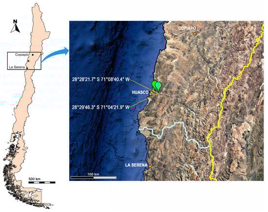 - Geographic distribution. Tebenna acanthophallus is known in Huasco (28°28′21.7″ S 71°08′40.4″ W) and Freirina (28°29′46.3″ S 71°04′21.9″ W), both in the Huasco Province, Atacama Region. According to the biogeographic classification proposed by [16], these localities belong to the Coquimbo Province, which is located between 26° and 33° south latitude of the Central Chilean Subregion, in the Andean Region (Figure 1).