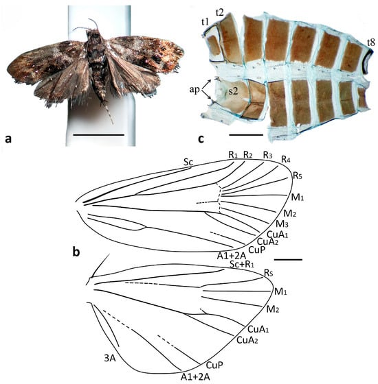 - Thorax. Dark brown, with appressed scales, tegulae of the same color; forewing dark brown to reddish brown with two silvery gray bands antemedially and postmedially, ochre spot basally subcostal, black spots medially and subterminally enclosing clusters of metallic gray scales, fringe dark brown; hindwing dark brown with lighter terminal line, long fringe of the same color; M3 vein absent (Figure 2b); prothoracic leg light gray; meso- and metathoracic legs silvery gray, tibia and tarsus banded with dark gray.