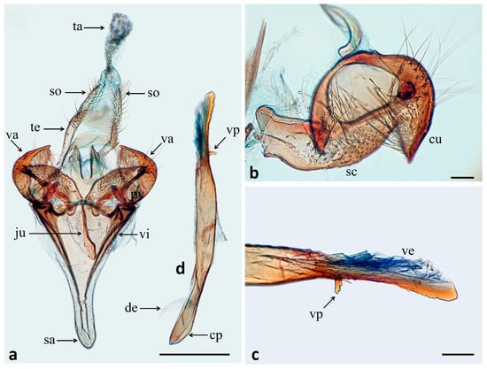 - Male genitalia (Figure 3). Tegumen narrow and band-shaped, widened medially; uncus slightly sclerotized and narrow, socii with long setae; vinculum-saccus broad basally, subtriangular, distal third narrow and slightly spatulate; juxta sclerotized rod-shaped (Figure 3a); valva longer than wide, ventral margin curved, covered by numerous long, thick setae; cucullus rounded with hooked ventral projection (Figure 3b); aedeagus 1.7 times vinculum length, substraight, straight spine-shaped ventral process located on distal fifth and protrusions toward apex (Figure 3c,d), coecum penis of similar thickness to rest of aedeagus, ductus ejaculatorius inserts dorsally; vesica not armed with cornuti.