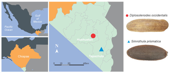 The slugs were collected in the municipalities of Tapachula (14°54′19.94″ N, 92°15′49.14″ W) and Huehuetán (15°01′09.26″ N, 92°22′56.35″ W), located in the south of Chiapas state, Mexico (Figure 1). Two specimens of each species were analyzed. The specimens were photographed in dorsal and ventral position, relaxed and fixed in absolute ethanol. Taxonomic classification was based on examining specialized literature on the family and the original description of the species [26,27,28,29,30,31,32,33].