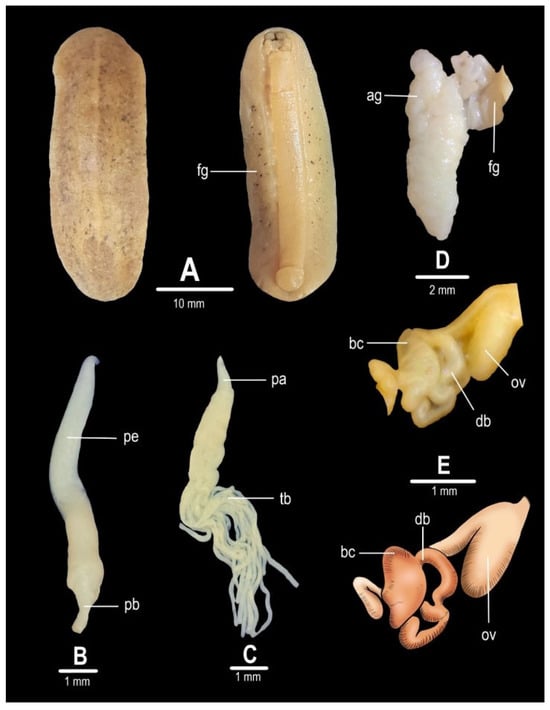 External morphology and anatomy of the specimens in this study. Pigmentation of notum reddish brown, with distinct yellowish midline; hyponotum (ventral region) and sole of beige color, the hyponotum with abundant dark punctuations (Figure 2A). Body length 36 ± 40 mm, smooth penis, 6 mm long, with a sheath around its anterior half, slightly curved towards the base, the digiform gland short with an elongate shape at tip 5 mm; with 15 narrow rounded tubules (tb) at the tip 10 ± 12 mm long. Retractor penis muscle 90 mm long, apparently with a flattened and thin papilla (pa), narrow, elongated and conical. Female gonopore (fg) almost half the length of the hyponotum. The bursa shows a constriction at the base that forms a bud-like structure, known as digitiform formation [32] (bc) (Figure 2E).