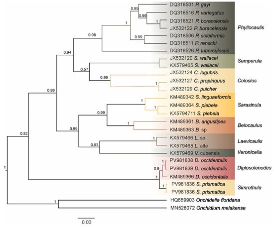 The molecular results are as follows: A 470 bp fragment of the 16S rRNA gene was obtained. Following the process of editing, a 376 bp fragment was utilized for the purpose of phylogenetic analysis, which corresponded to the sequence length reported in GenBank. The sequences obtained for the individuals from the Tapachula municipality (PV981836 and PV981837) exhibited a 97% similarity with the Diplosolenodes occidentalis GenBank sequence KM489366.1, while those corresponding to the individuals from Huehuetán (PV981838 and PV981839) demonstrated a 98.36% similarity with this same sequence. For the purpose of the phylogenetic analysis, we used 21 veronicellid sequences reported in GenBank for the same gene fragment belonging to eight genera of the family (Belocaulus Hoffmann, 1925, Colosius Thomé, 1975, Diplosolenodes Thomé, 1975, Laevicaulis Simroth, 1913, Phyllocaulis Colosi, 1922, Sarasinula Grimpe & Hoffmann, 1924, Semperula Grimpe & Hoffmann, 1924, Veronicella Blainville, 1817), and two onchid genera (Onchidella Gray, 1850 and Onchidium Buchannan, 1800). The resulting phylogenetic tree strongly supports the identification of the specimens as Diplosolenodes occidentalis, as the sequences obtained in this study cluster together with those reported in GenBank for that species. Conversely, given the lack of available sequences for the genus Simrothula, it was not possible to compare our molecular results with those of related taxa. The phylogenetic relationships observed in the tree are strongly supported and are consistent with the morphology-based phylogenetic tree reported by Gomes [41] (Figure 4).