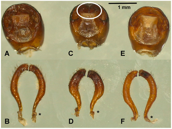 External male genitalia of T. dimidiata. Pygophore of morphotypes I (A), II (C), and III (E). Dorsal view of the left and right of morphotypes I (B), II (D), and III (F) parameres. The asterisks indicate the sites where the parameres articulate with the pygophore. The median process of the pygophore is long and thin in morphotype II (white circle, Figure 3C).