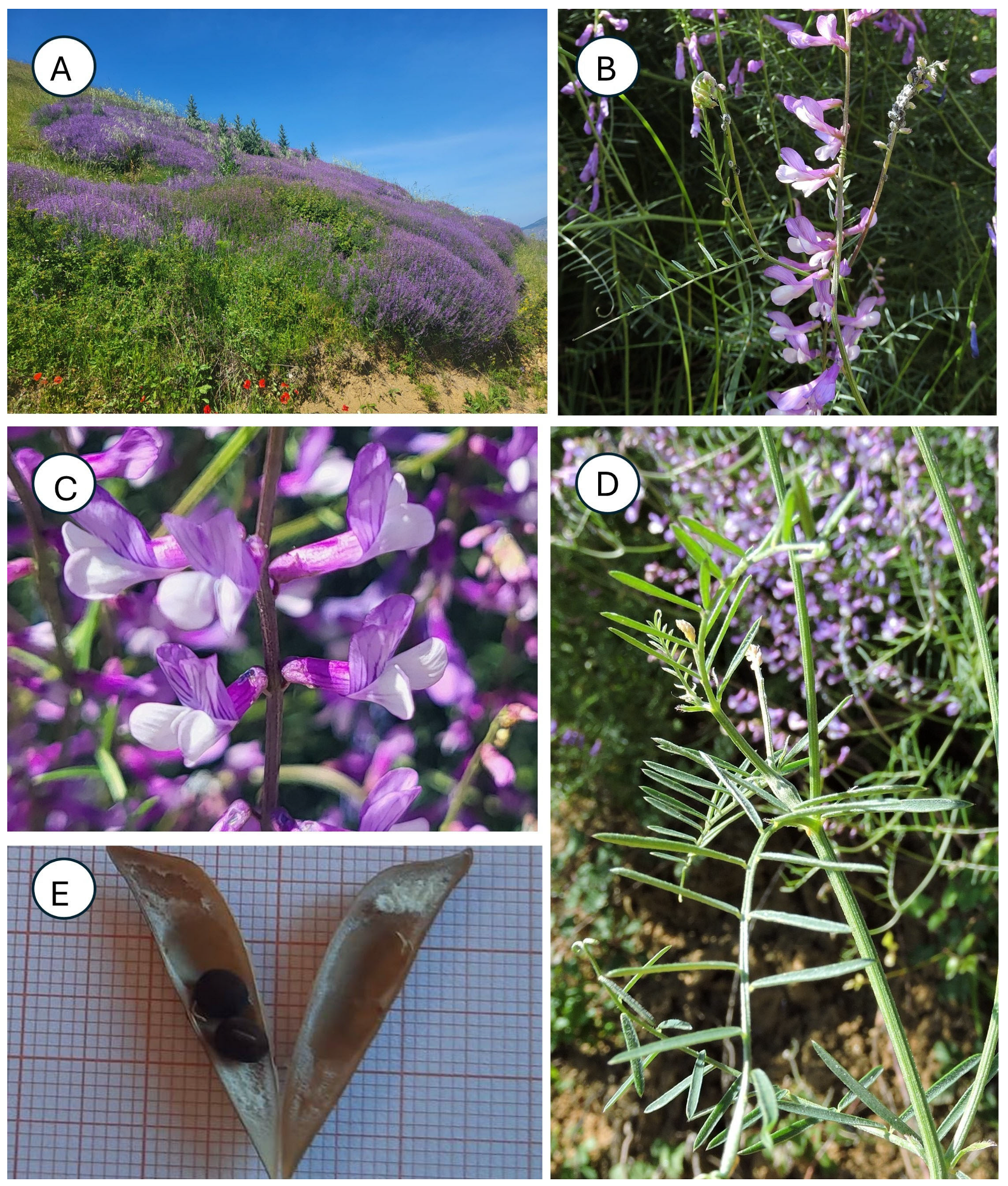 - Ball, P.W. Vicia L. In Flora Europaea; Tutin, T.G., Heywood, V.H., Burges, N.A., Moore, D.M., Valentine, D.H., Walters, S.M., Webb, D.A., Eds.; Cambridge University Press: Cambridge, UK, 1972; Volume 3, pp. 129–136. [Google Scholar]