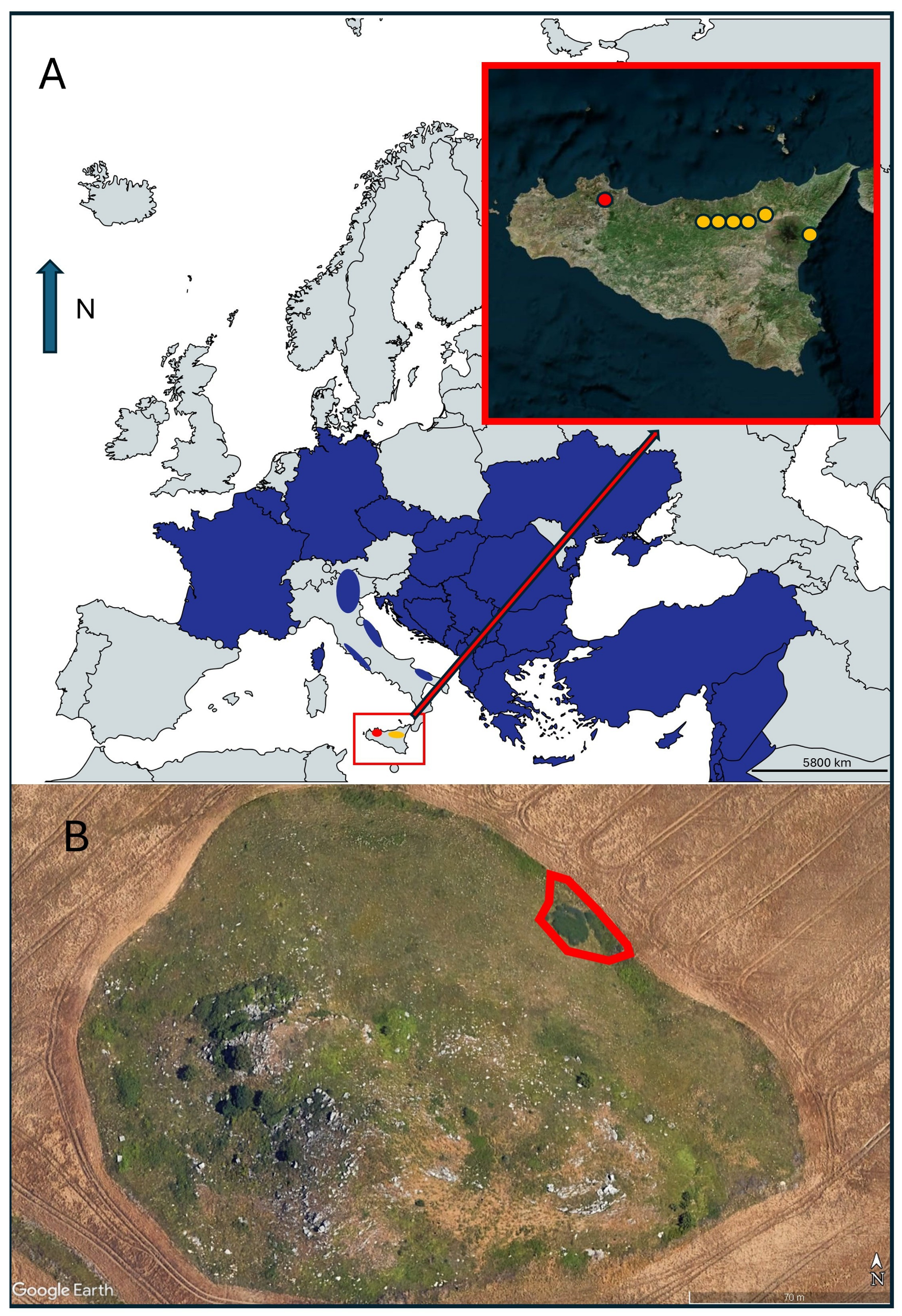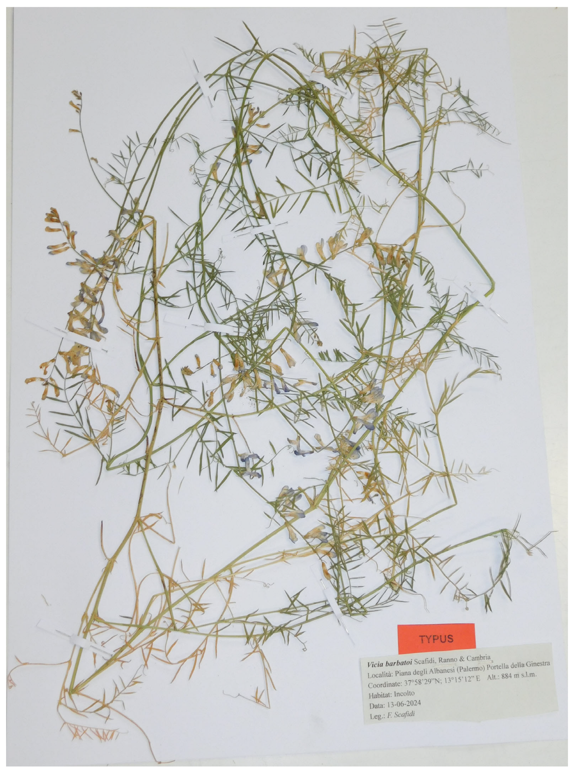 - Sciandrello, S.; Giusso del Galdo, G.; Salmeri, C.; Minissale, P. Vicia brulloi (Fabaceae), a new species from Sicily. Phytotaxa 2019, 418, 57–78. [Google Scholar] [CrossRef]