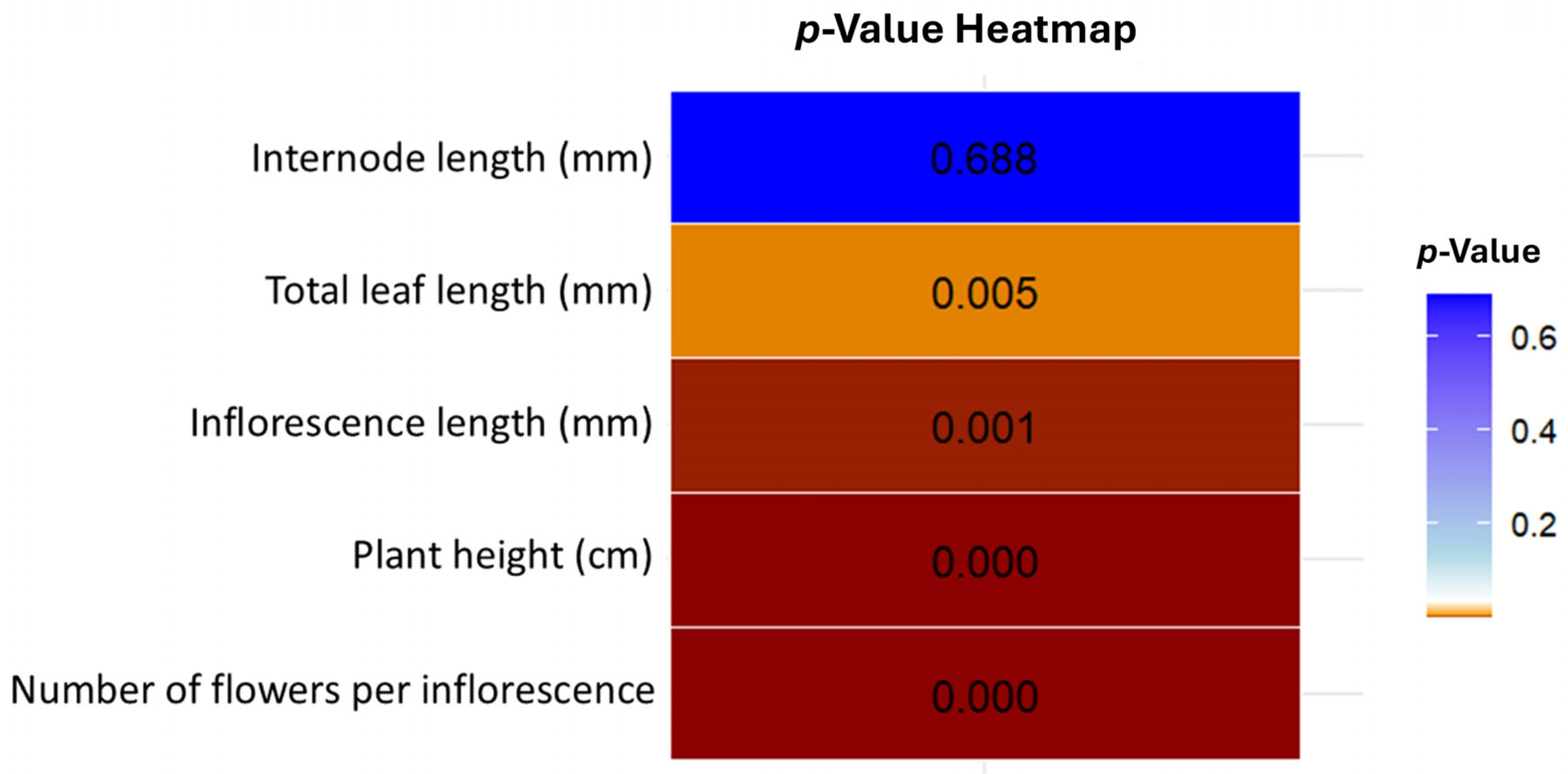 | 4 Inflorescence length | 0.164 | −0.570 | 7.28 × 10−2 | 0.753 |