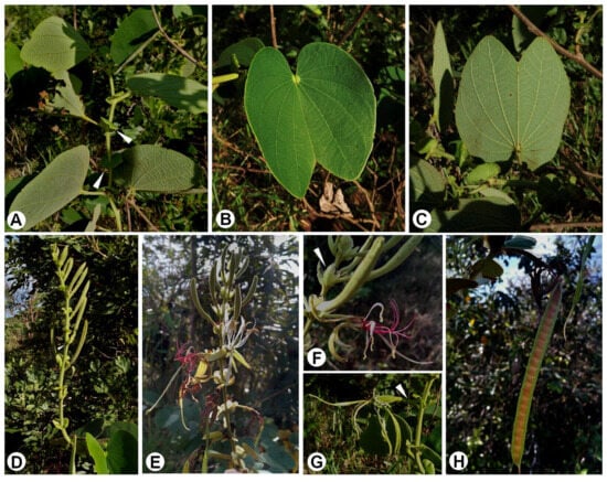 Figure 3. General of aspects of Bauhinia latistipulata. (A) Habit. Stipules highlighted by the arrow. (B) Adaxial surface leaf. (C) Abaxial surface leaf. (D,E) Inflorescence variation. (F,G) Post-pollination flowers: filaments shift to pink tones after pollination. The arrows indicate the position of bracts and bracteoles at the base of the pedicel. (H) Fruit.