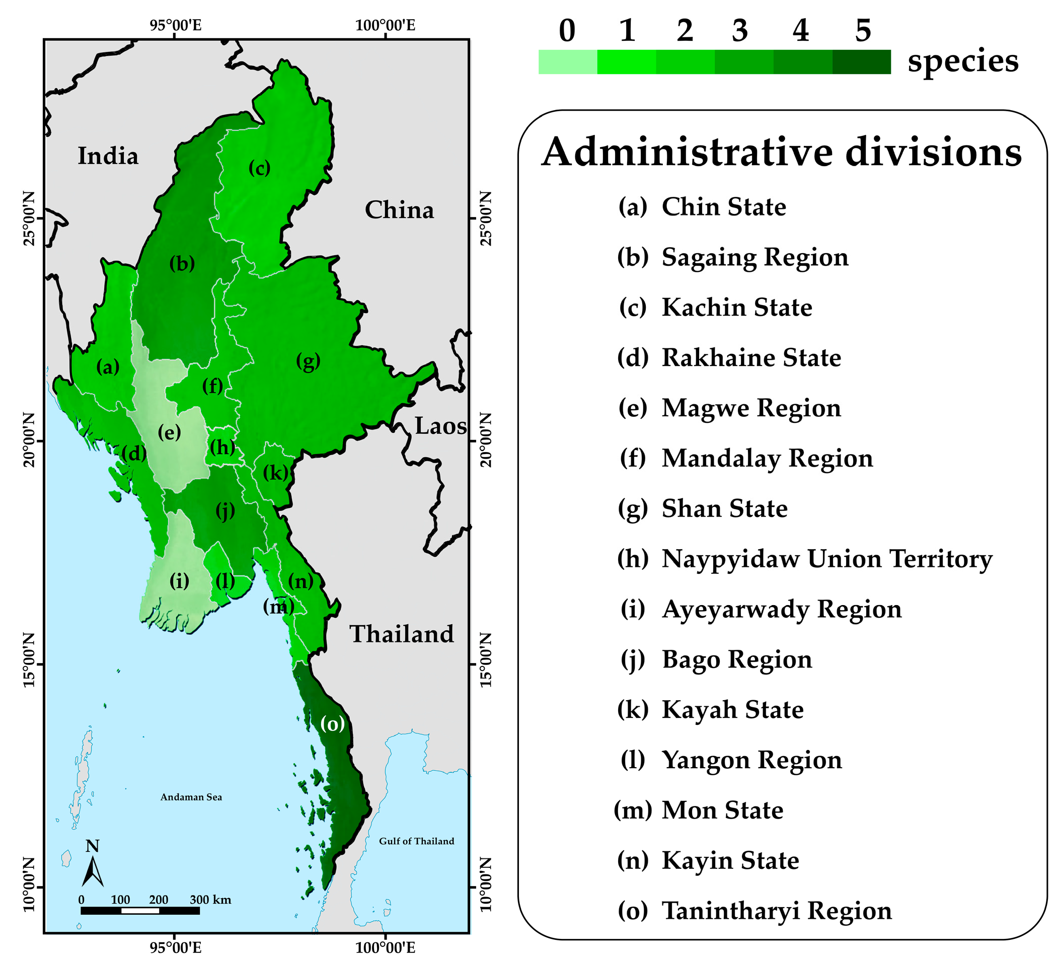- Aung, Y.L.; Aung, M.H.; Tan, Y.; Jin, X. An updated checklist of vascular plants of Myanmar. PhytoKeys 2025, 261, 135–164. [Google Scholar] [CrossRef]