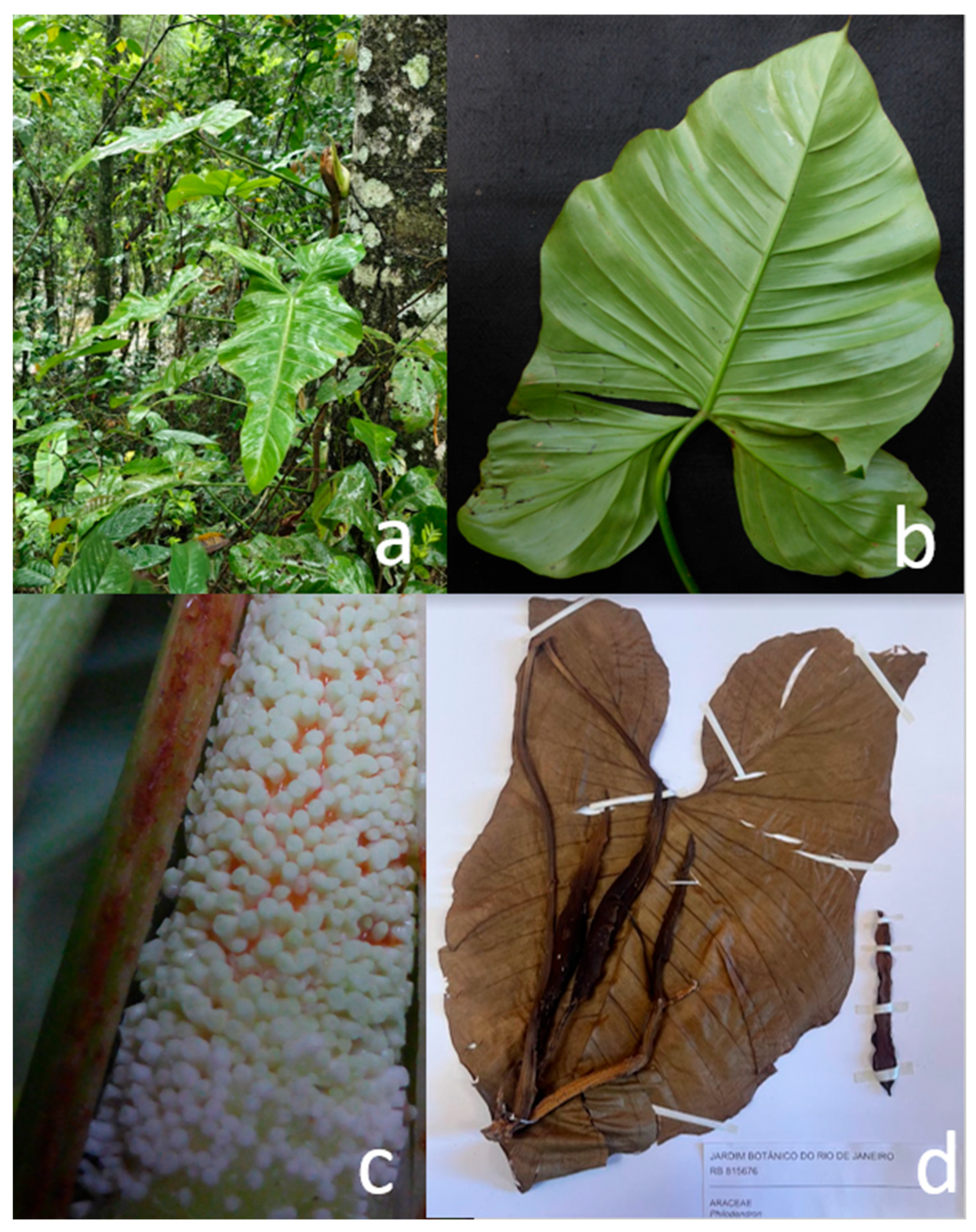 - Coelho, M.A.N. Philodendron Schott (Araceae): Morfologia e taxonomia das espécies da Reserva Ecológica de Macaé de Cima-Nova Friburgo, Rio de Janeiro, Brasil. Rodriguésia 2000, 51, 21–68. [Google Scholar] [CrossRef]