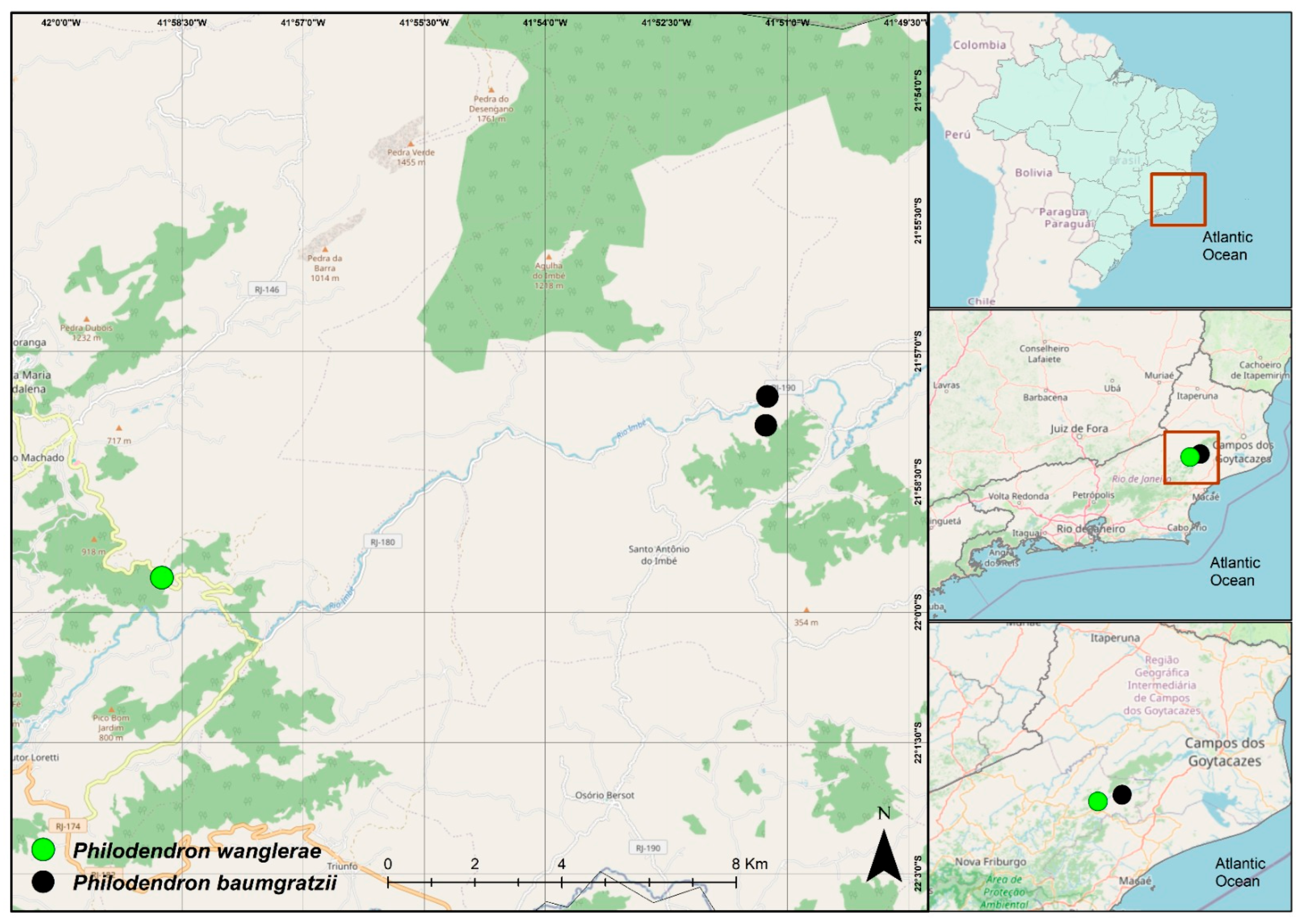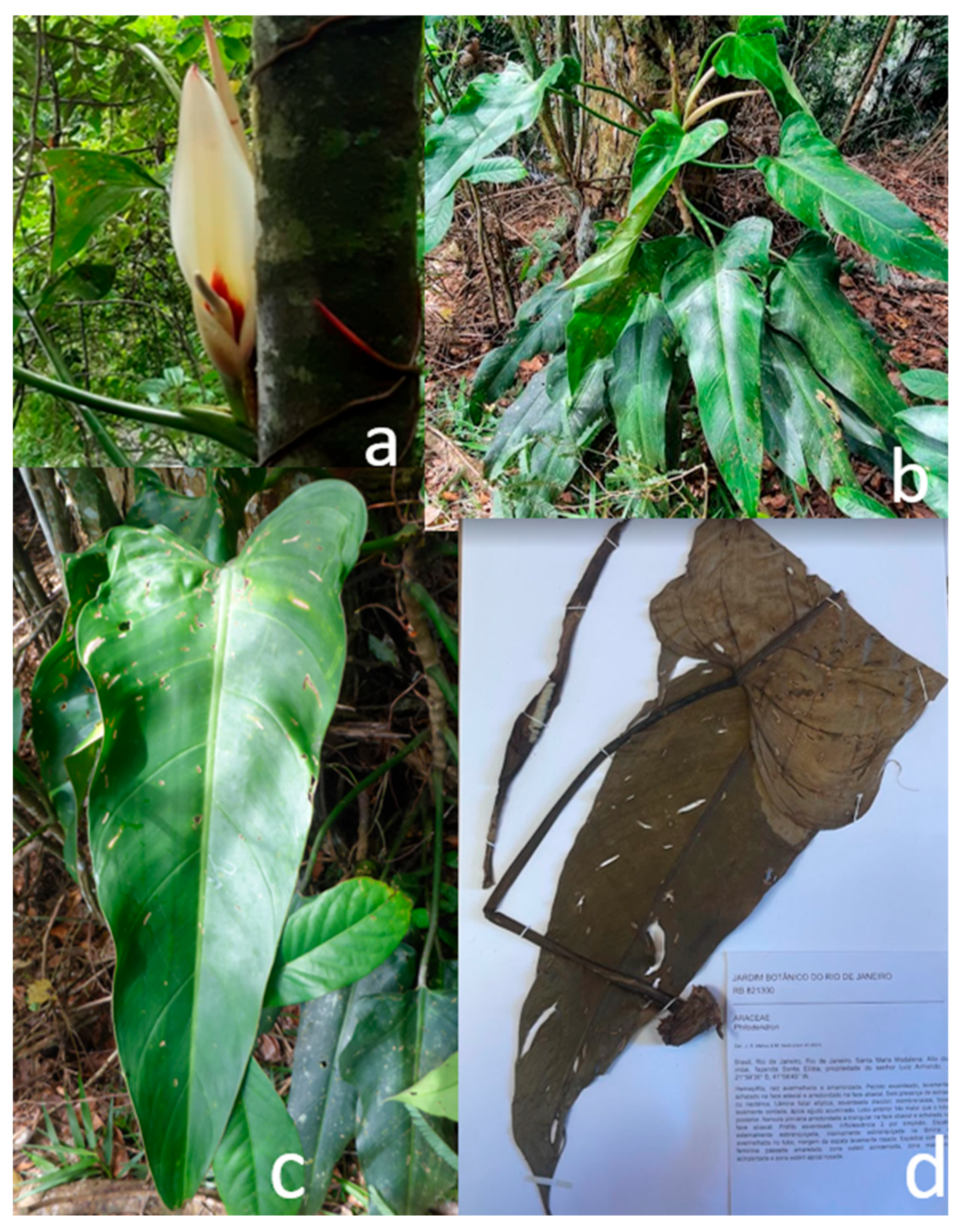 - Mattos, J.R.; Coelho, M.A.N.; Baumgratz, J.F.A. New species of Philodendron (Araceae) from the Brazilian Atlantic Forest, Brasil. Rodriguésia 2023, 74, e01652021. [Google Scholar] [CrossRef]