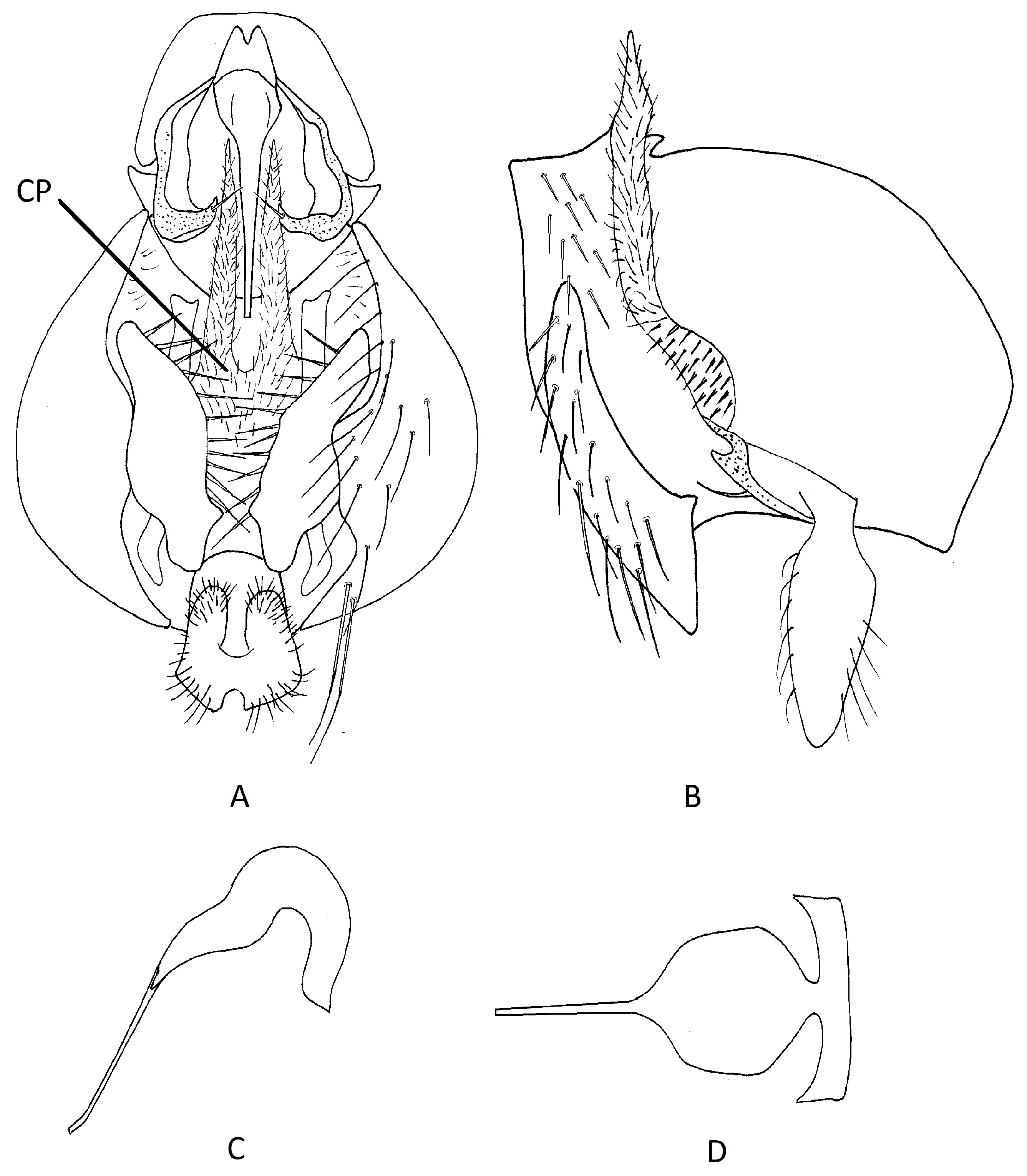Figure 1A—CP) reduced to a membranous structure covered in small, short setulae on posterior portion, anteriorly divided into two long, narrow setulose processes which extend almost to base of phallus. Pregonite extending from base of phallus into shell of epandrium, narrow anteriorly than broadening out, apically forming a large, blunt medially directed tooth, which is slightly sclerotized, a strong apical seta present. Phallus bi-segmented; in lateral view basiphallus broad and sinuous, distiphallus a long, straight narrow tube, slightly bent near apex, in ventral view with a distinct basal plate and swollen basiphallus