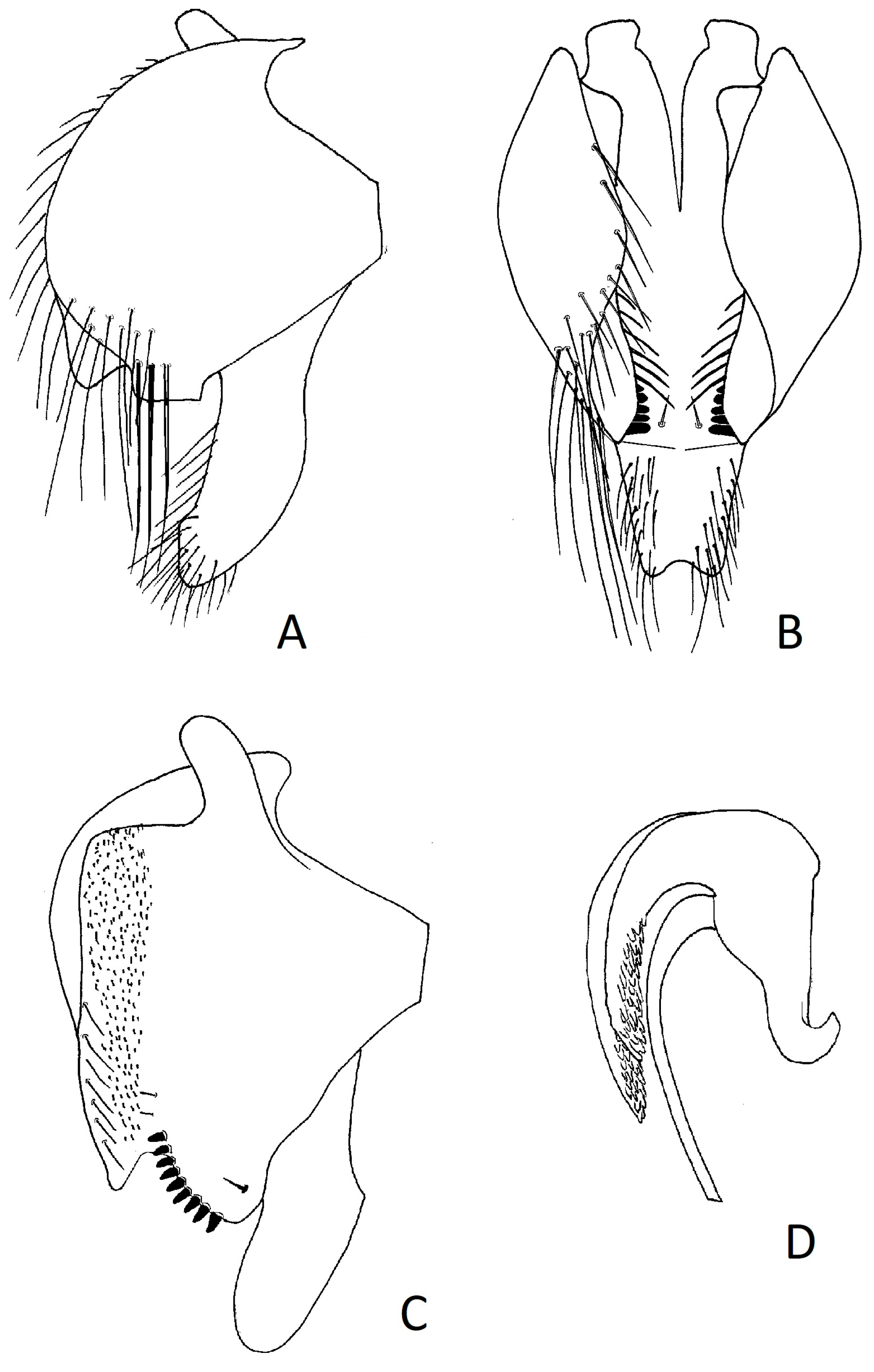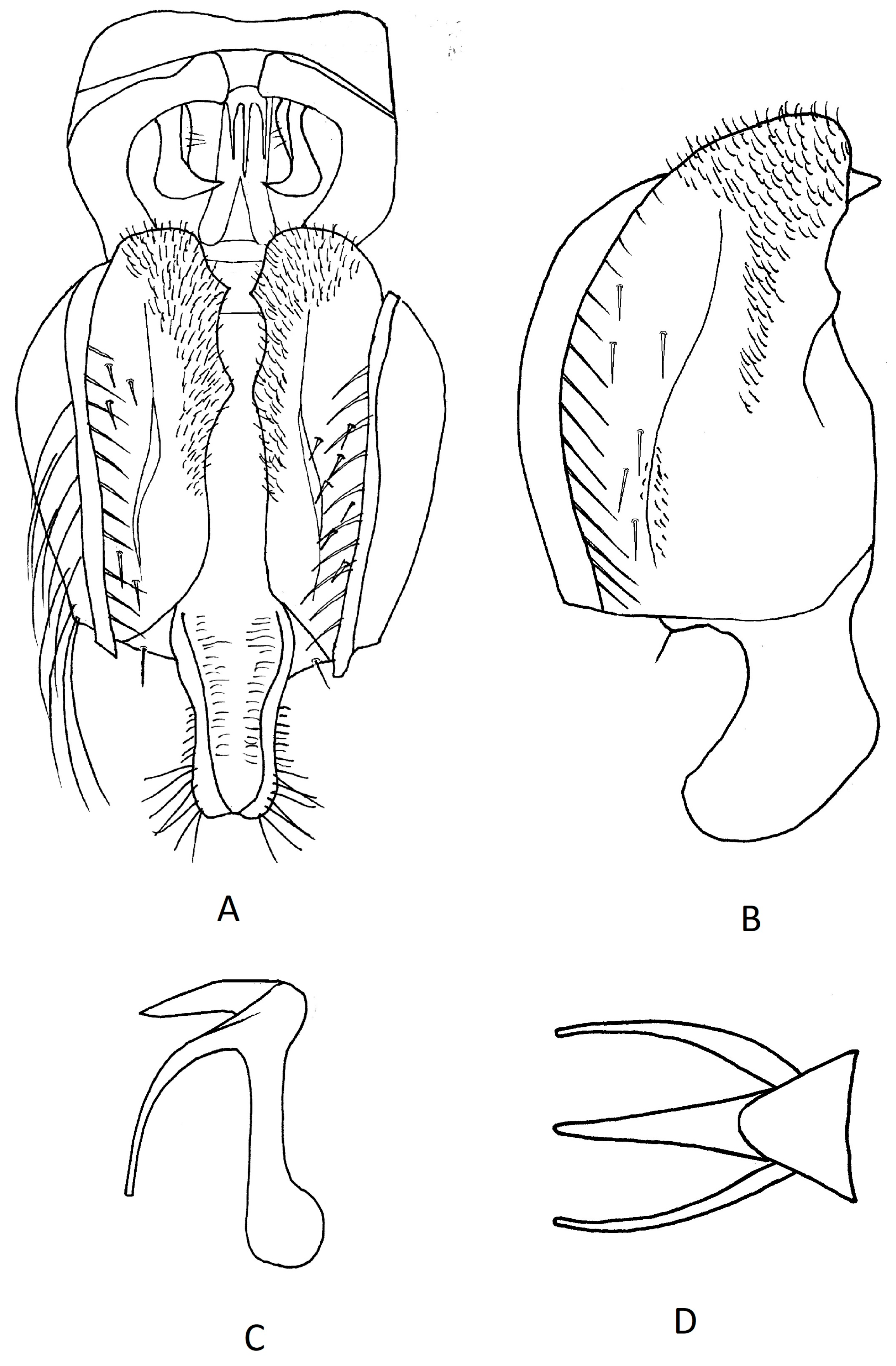 Male genitalia. Epandrium medially compressed, 0.6× as high as it is wide, extended dorsally into a long thin process, rounded anteriorly and undulating along posterior margin, numerous long curved setae on the posteroventral angle of the epandrium, the longest of these almost as high as a cercus; shorter, scattered setae located near the posterior margin. Three peg-like structures, half the height of the cercus, arising in an equally spaced row midway between the base of the cercus and the posteroventral angle of the epandrium. Cercus finger-like, 0.7× the height of the epandrium at its deepest point, densely covered with short setae apically. Surstylus projecting posteriorly beyond the shell of the epandrium posteriorly as a rather flat rectangular process bearing five small prensisetae, only slightly visible as a rounded setulose process ventrally. In posterior view, a long, medially directed, sharply pointed, bifurcated process arising from the ventral margin of the surstylus. Phallus club-shaped, distiphallus half the height of the basiphallus, with a pair of lateral processes which are as long and strong as the distiphallus.