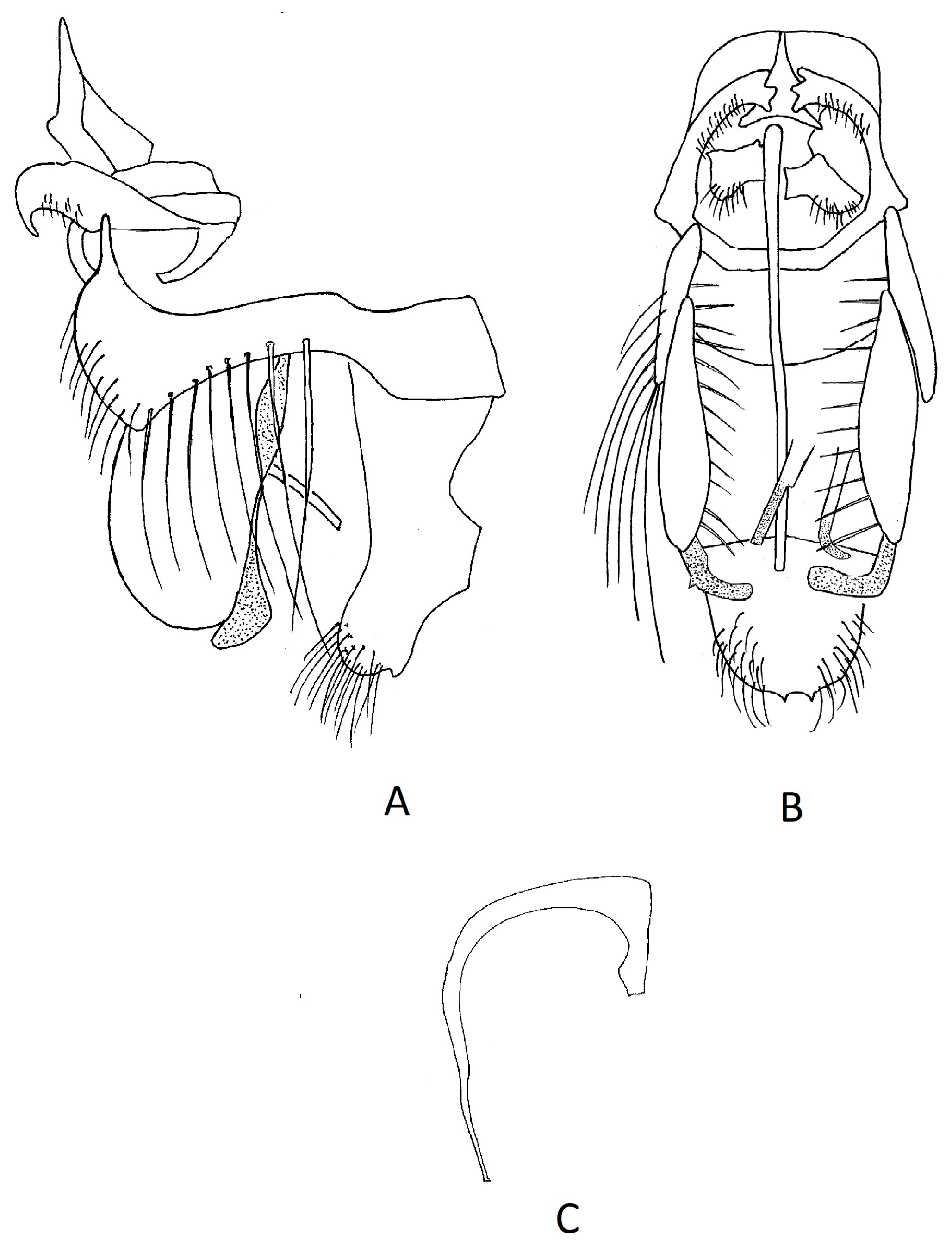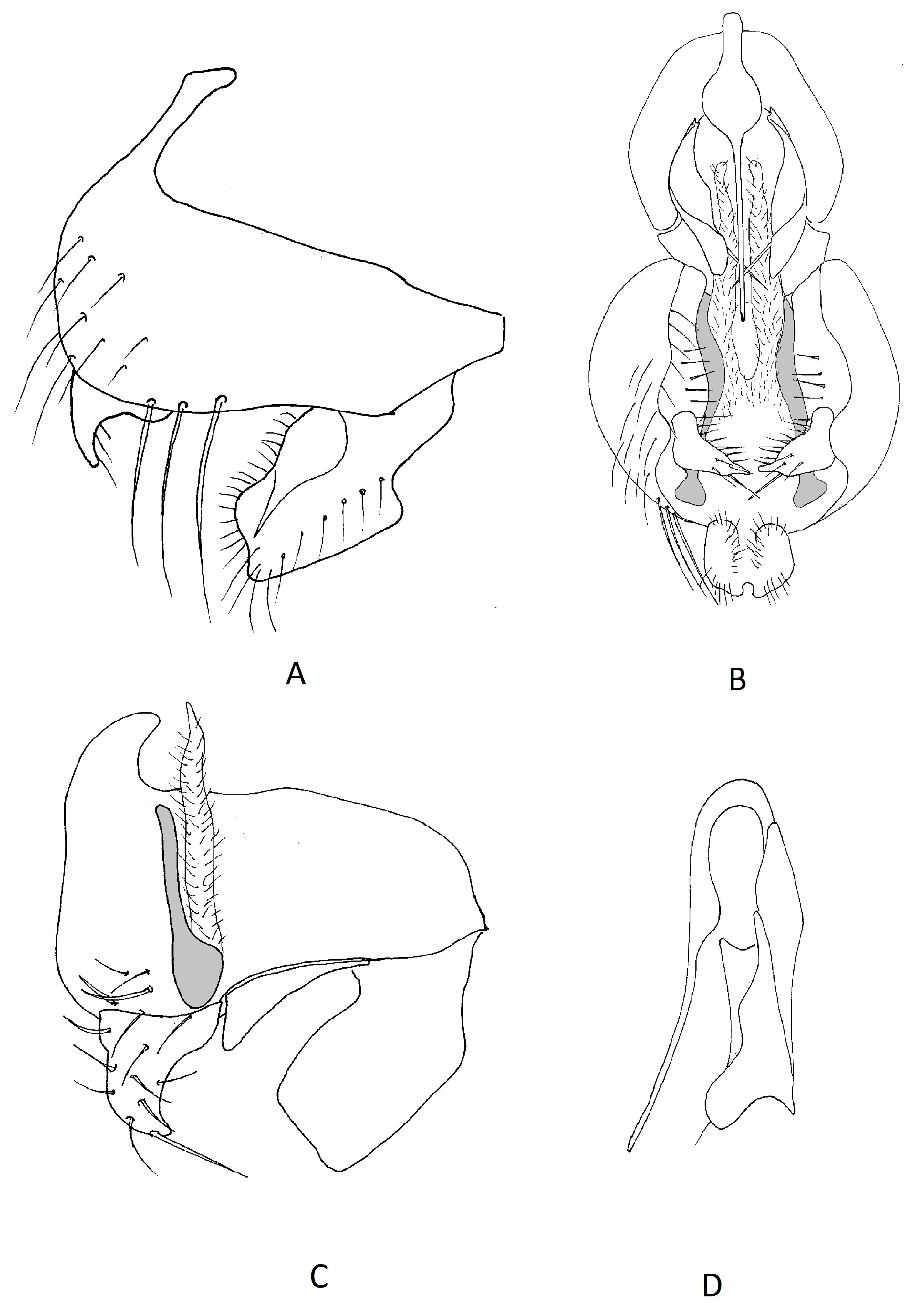 Male terminalia: In lateral view epandrium approximately 2× as high as it is wide, setulose on posterior and ventral margins. Cercus rather rectangular, approximately 0.3× height of epandrium, setulose apically. Surstylus in ventral view with inner surface densely setulose posteriorly and anteriorly, posterior margin with a single large, slightly curved, medially directed prensiseta, two slightly smaller prensisetae situated in a posterior–anterior row approximately midway along the inner surface. Pregonites simple, strap-like. Phallus J-shaped, bi-segmented, very long, extending to the cercus, basiphallus long and thin, slightly shorter than distiphallus, distiphallus a long thin tube, slightly sinuate.