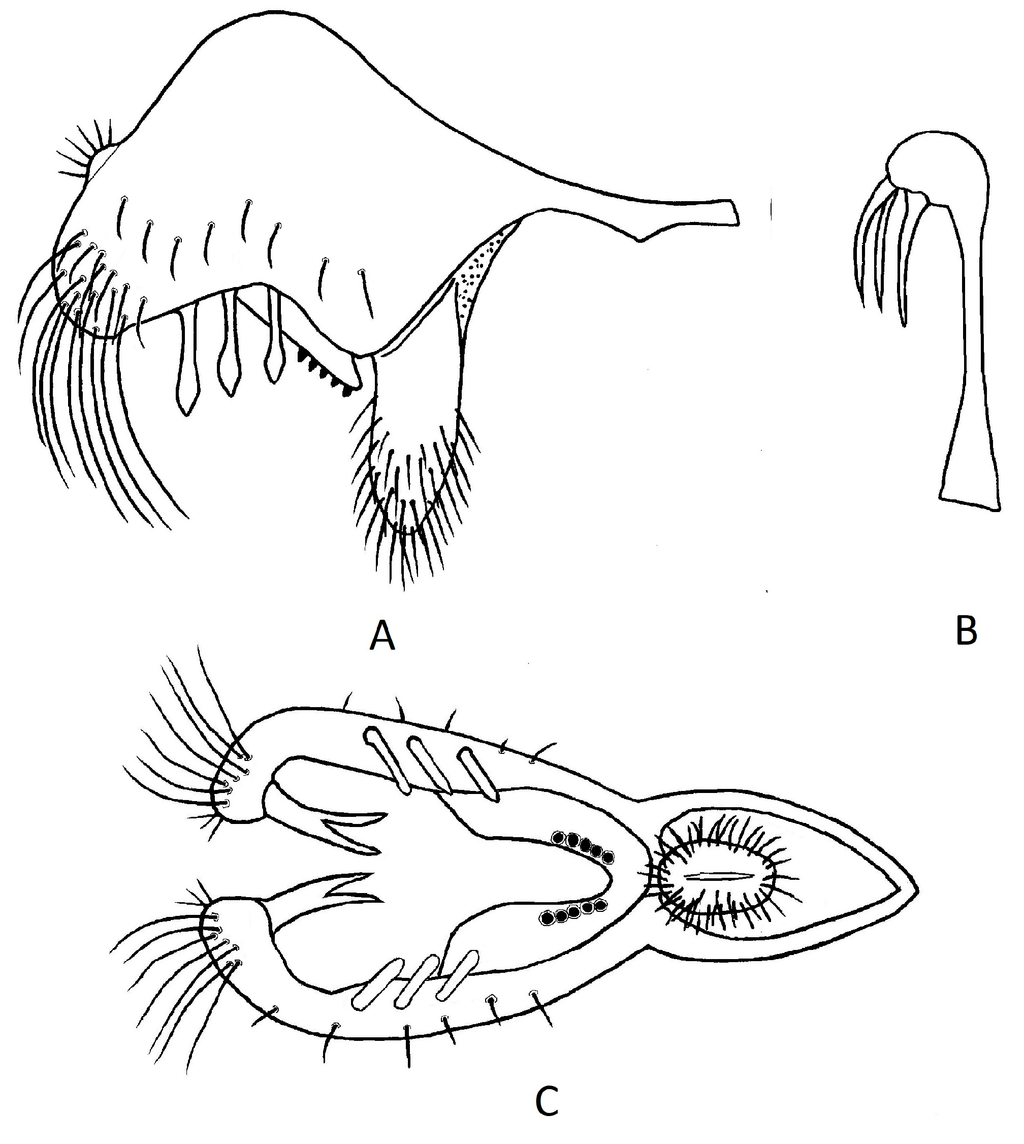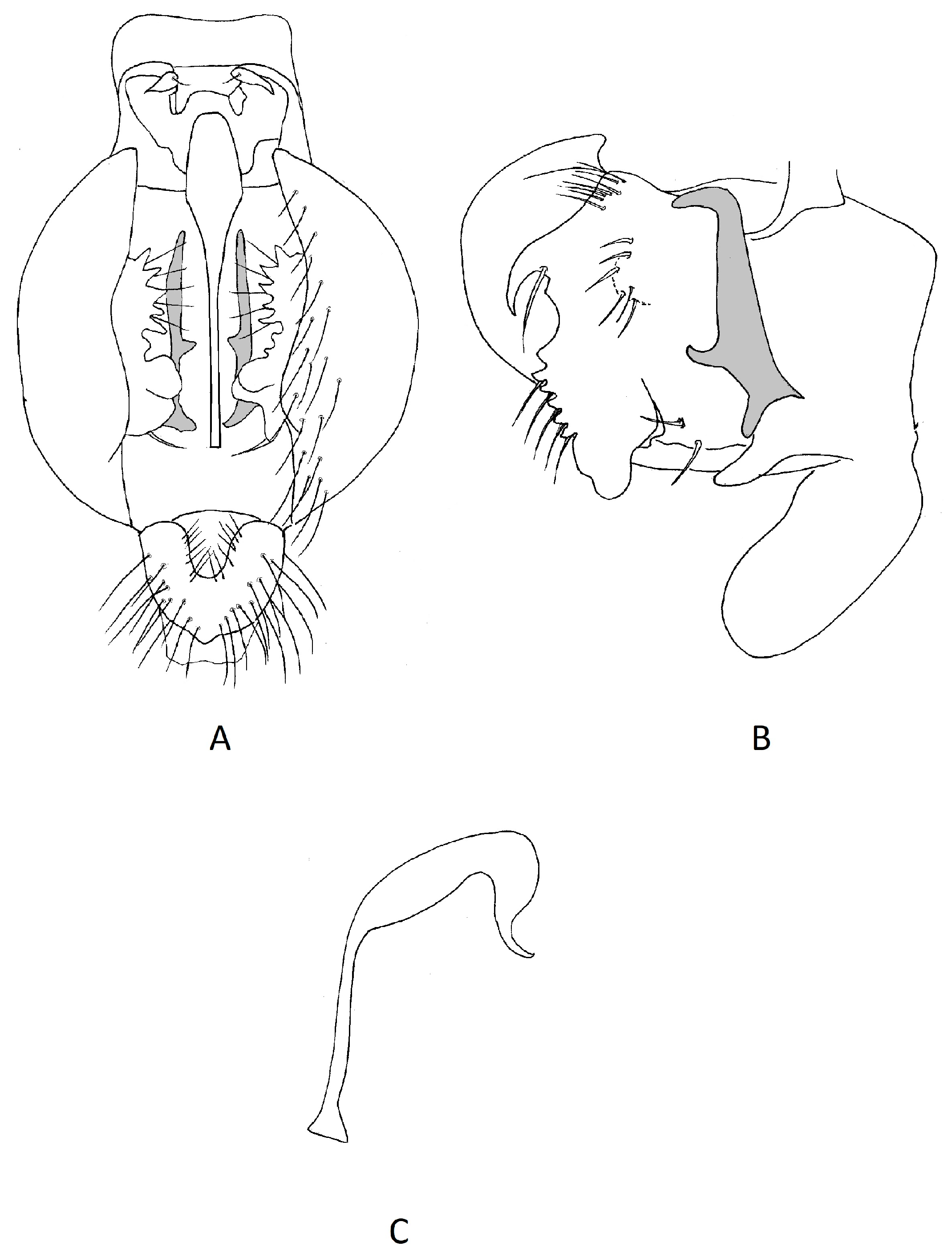 Male terminalia: In lateral view epandrium 1.5× wider than high, with a long antero-ventral projection, three long, strong setae along posterior margin, scattered setulae ventrally. Cercus relatively large, height almost equalling that of epandrium, roughly rectangular in shape, bearing a fringe of setulae on ventral margin and a loose row of setulae posteriorly. Surstylus projecting beyond shell of epandrium posterior-ventrally as a hook-shaped process. In ventral view surstyli small, pistol-shaped, projecting medially to a blunt point, with stiff, strong setulae along medial margin and apices. Central plate membranous, with two apical leg-like setulose projections which almost reach to the base of the phallus. Lying laterally to the central plate a long narrow process, reaching anteriorly almost to the margin of the epandrium, slightly thickened at posterior end. Phallus in lateral view an open J-shape with a conspicuous medial bulge basally, in lateral view this bulge is seen to be a circular expansion of the phallus.