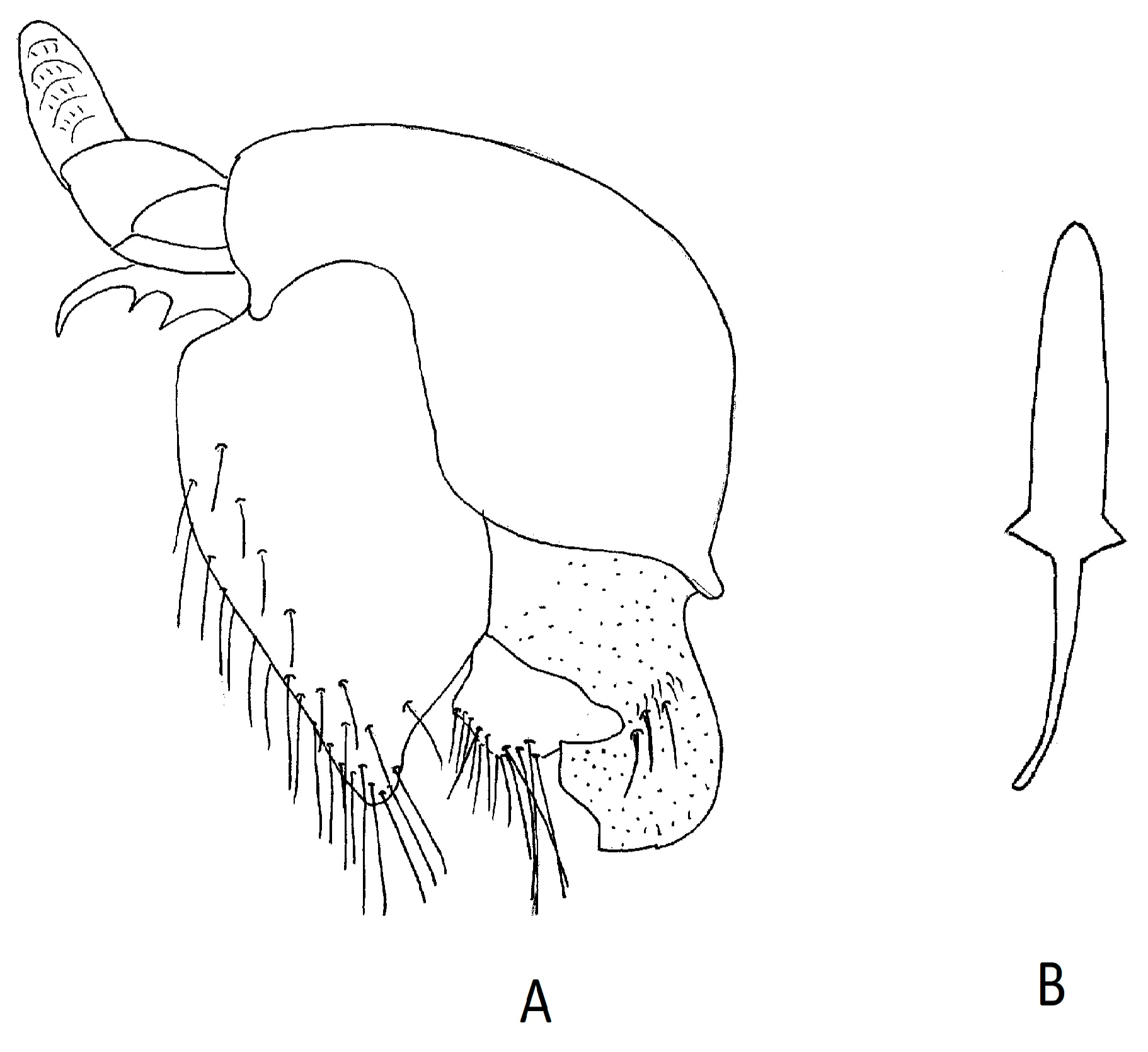 Figure 5 LP) well developed, apical portion sclerotized and curved medially. Membranous element produced anteriorly as two thin, pointed setulose processes. Pregonites simple and strap-like, apically with long, pointed, partly sclerotized processes, apical seta long and strong. Phallus; not segmented, a relatively simple J-shape becoming slightly narrower apically.