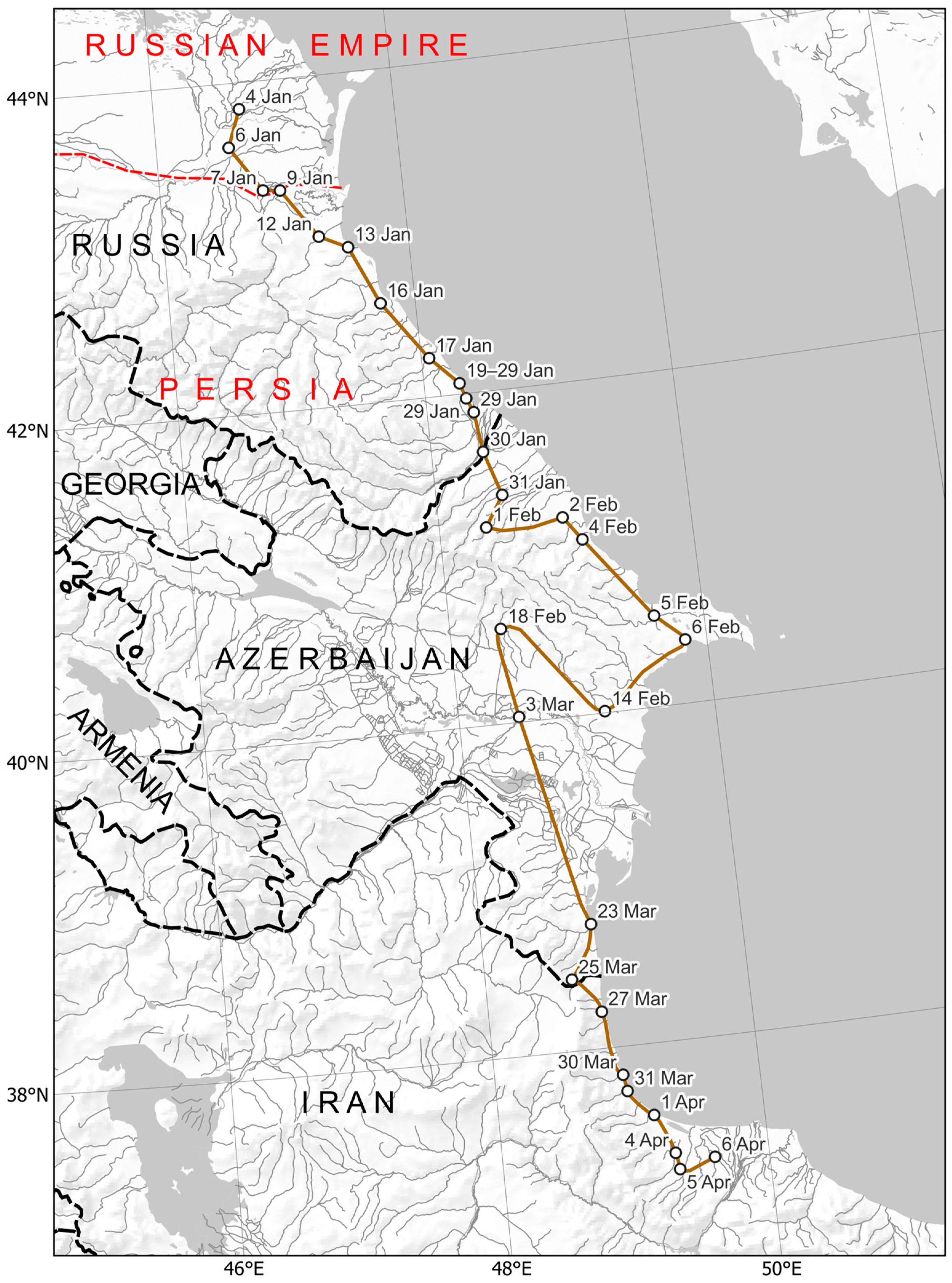 - Polievktov, M.A. European Travellers of 13th–18th centuries in the Caucasus; Academy of Sciences of the USSR: Tiflis, USSR, 1935. (In Russian) [Google Scholar]