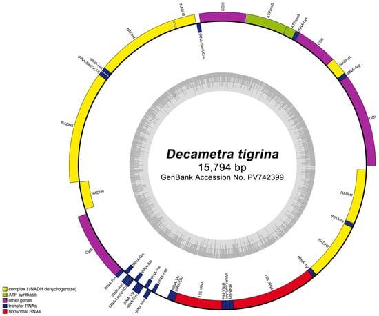 Figure 2. Circular mitochondrial genome map of Decametra tigrina generated in this study. The inner circle corresponds to the L strand, while the outer circle denotes the H strand.